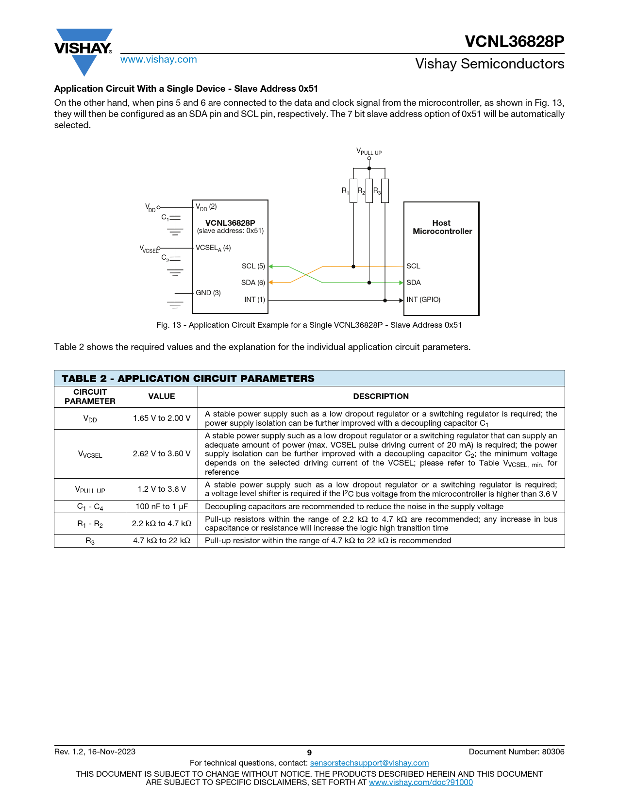 V VCSEL (4) VCSEL A C2 SCL (5) SCL SDA (6) SDA GND (3) INT (1) INT (GPIO) Fig. 13 - Application Circuit Example for a Single VCNL36828P - Slave Address 0x51 Table 2 shows the required values and the explanation for the individual application circuit parameters.