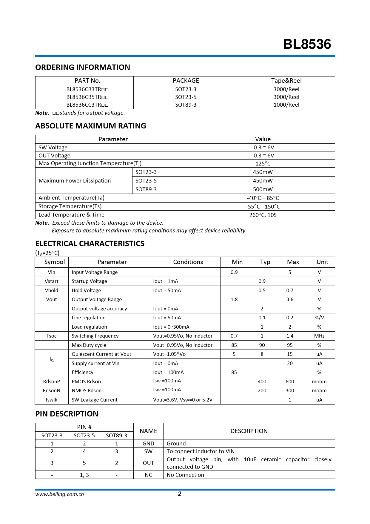 PIN # NAME DESCRIPTION SOT23-3 SOT23-5 SOT89-3 1 2 1 GND Ground 2 4 3 SW To connect inductor to VIN Output voltage pin, with 10uF ceramic capacitor closely 3 5 2 OUT connected to GND - 1, 3 - NC No Connection www.belling.com.cn