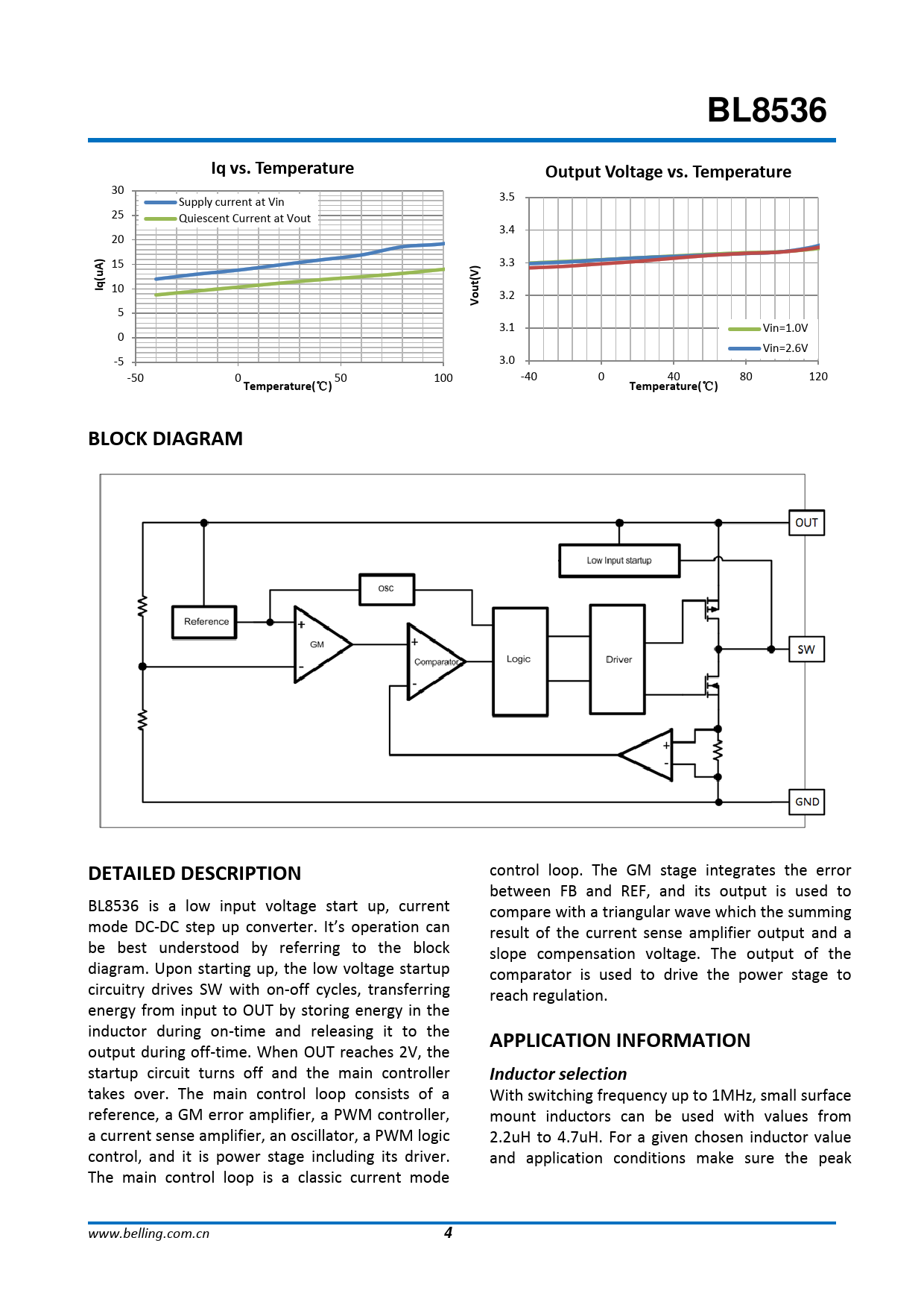 BL8536Iq vs. TemperatureOutput Voltage vs. Temperature 30 Supply current at Vin 3.5 25 Quiescent Current at Vout 3.4 20 ) 15 3.3 )uA(VIq( 10 out 3.2 V 5 3.1 Vin=1.0V 0 Vin=2.6V -5 3.0 -50 0 50 100 -40 0 40 80 120 Temperature( ℃ )Temperature( ℃ )BLOCK DIAGRAMDETAILED DESCRIPTION control loop. The GM stage integrates the error between FB and REF, and its output is used to BL8536 is a low input voltage start up, current compare with a triangular wave which the summing mode DC-DC step up converter. It’s operation can result of the current sense amplifier output and a be best understood by referring to the block slope compensation voltage. The output of the diagram. Upon starting up, the low voltage startup comparator is used to drive the power stage to circuitry drives SW with on-off cycles, transferring reach regulation. energy from input to OUT by storing energy in the inductor during on-time and releasing it to the APPLICATION INFORMATION output during off-time. When OUT reaches 2V, the startup circuit turns off and the main controller Inductor selection takes over. The main control loop consists of a With switching frequency up to 1MHz, small surface reference, a GM error amplifier, a PWM controller, mount inductors can be used with values from a current sense amplifier, an oscillator, a PWM logic 2.2uH to 4.7uH. For a given chosen inductor value control, and it is power stage including its driver. and application conditions make sure the peak The main control loop is a classic current mode www.belling.com.cn 4