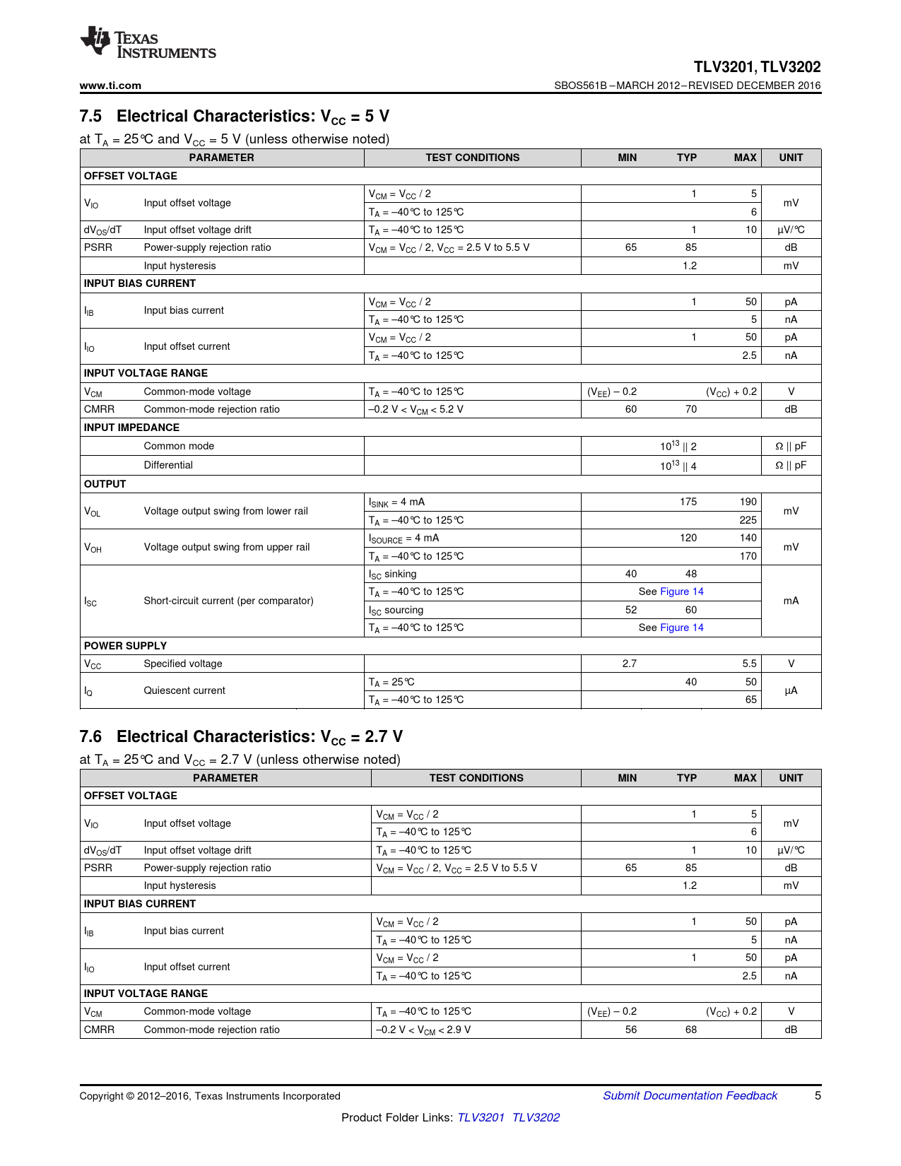 TLV3201,. TLV3202. www.ti.com. 7.5 Electrical Characteristics: VCC = 5 V. PARAMETER. TEST CONDITIONS. MIN. TYP. MAX. UNIT. OFFSET VOLTAGE