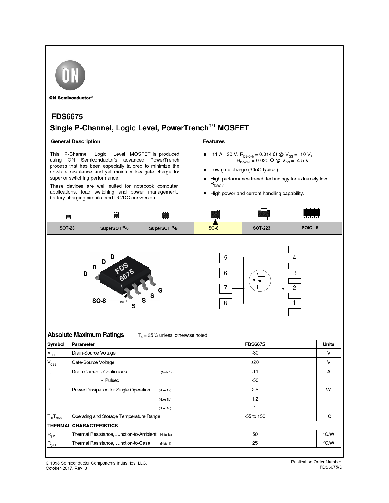FDS6675. Single P-Channel, Logic Level, PowerTrenchTM MOSFET. General Description. Features. SOT-23. SuperSOTTM-6. SuperSOTTM-8. SO-8