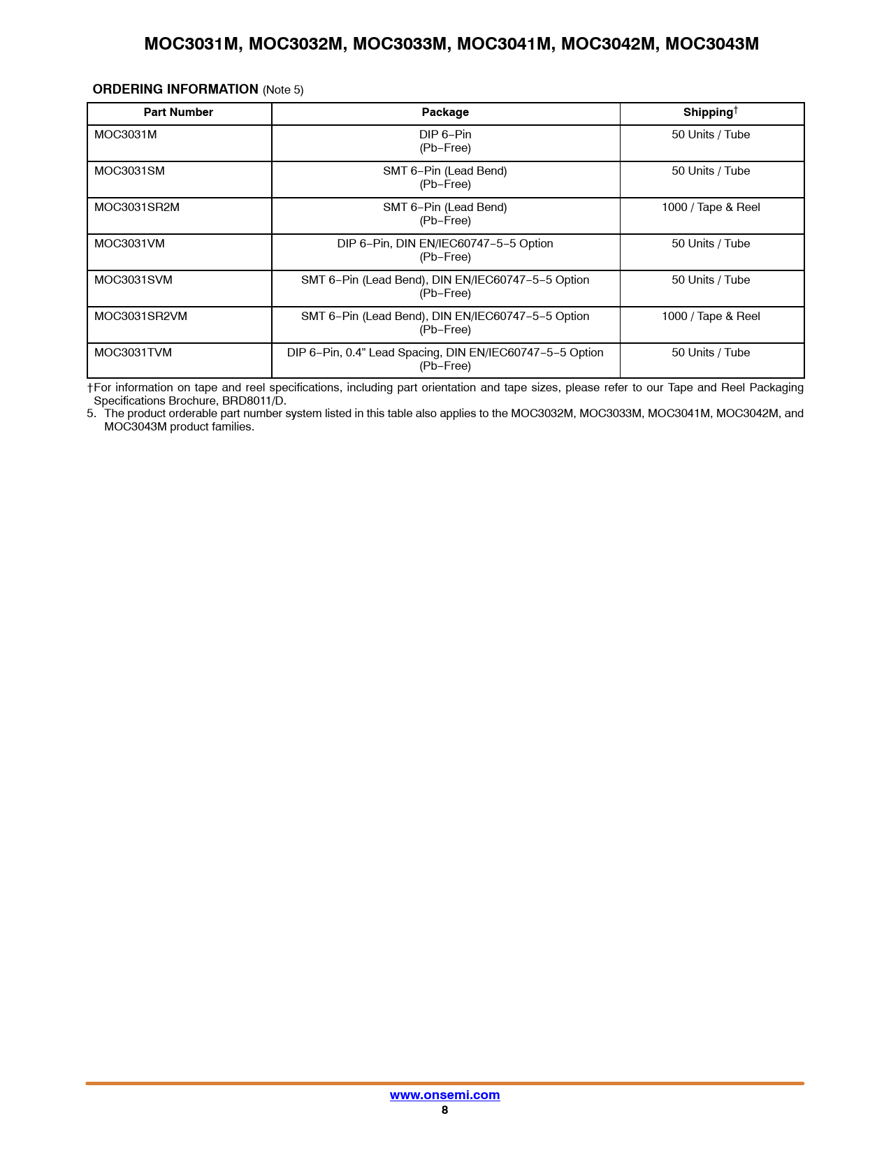 MOC3031M, MOC3032M, MOC3033M, MOC3041M, MOC3042M, MOC3043M. ORDERING INFORMATION. Part Number. Package. Shipping. www.onsemi.com