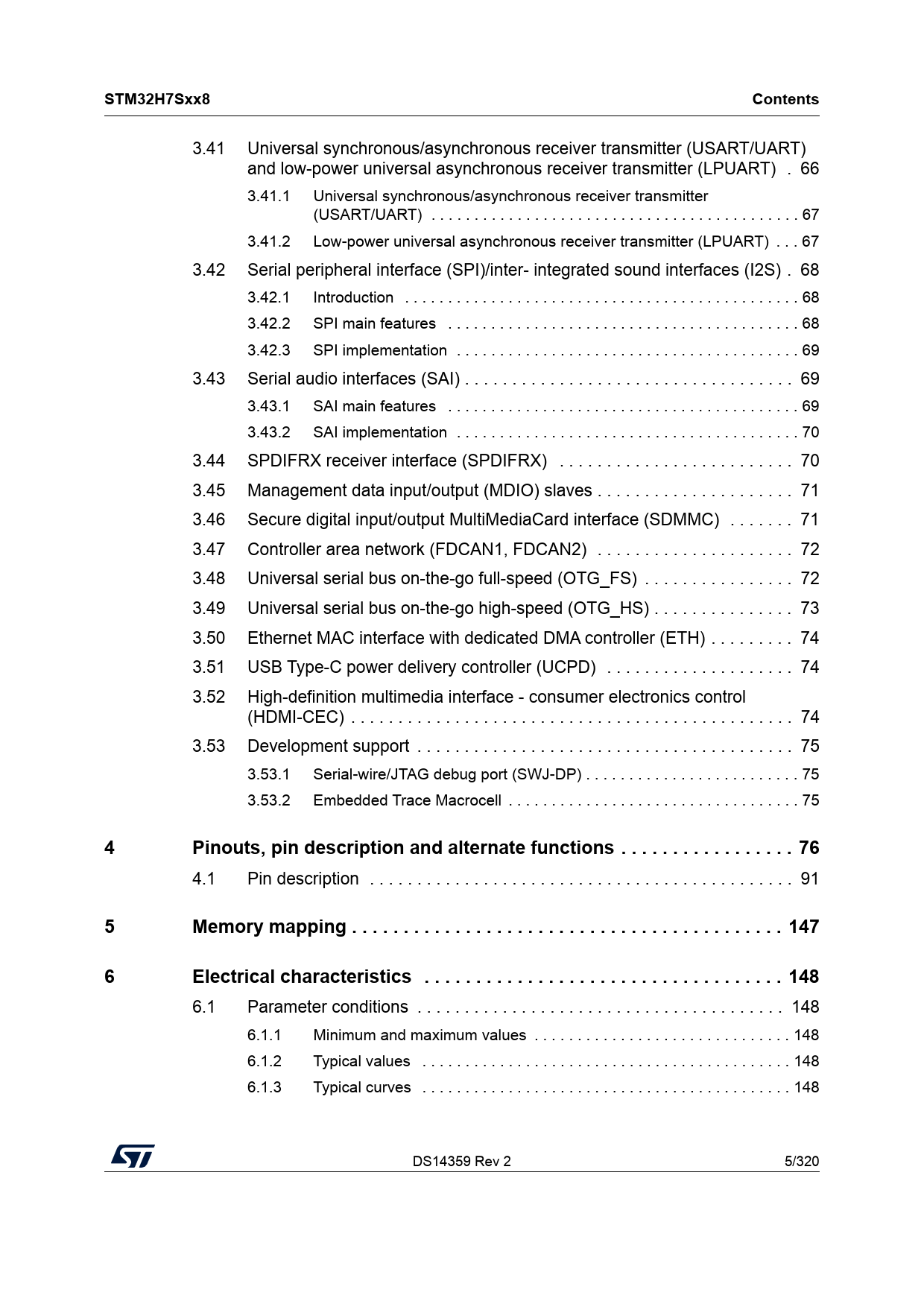 STM32H7Sxx8. Contents. Pinouts, pin description and alternate functions . 76. Memory mapping . 147