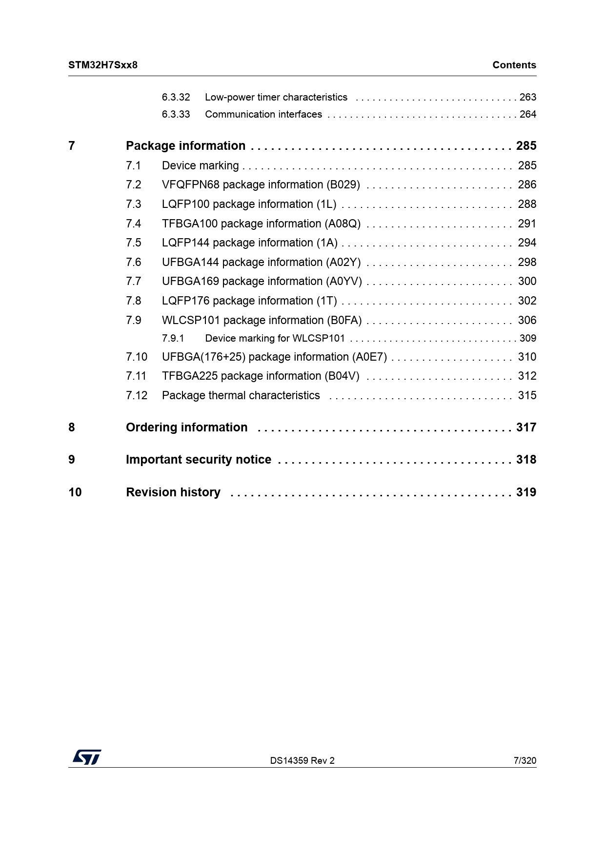 STM32H7Sxx8. Contents. ackage information . 285. Ordering information . 317. Important security notice . 318