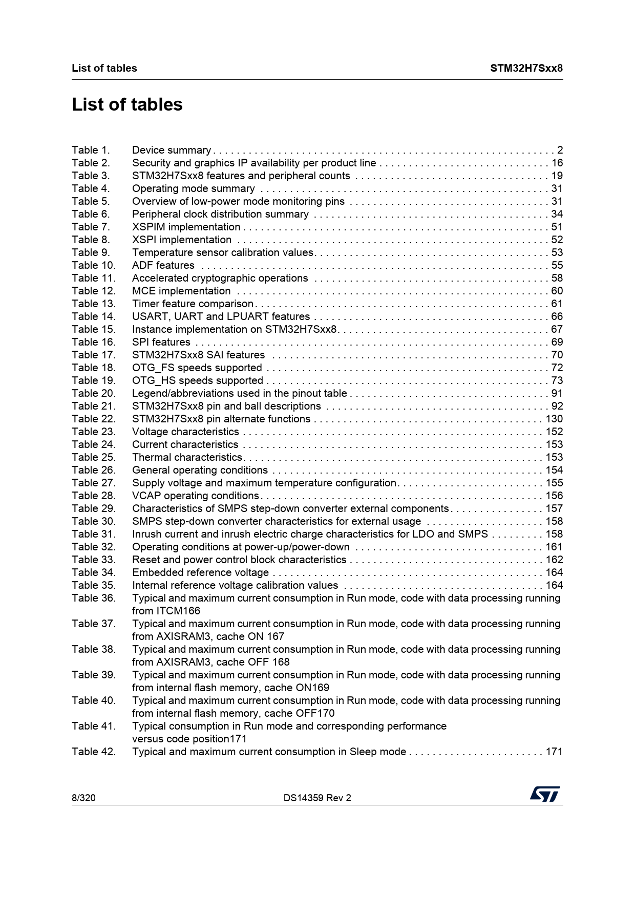 | 页数 / 页 | 320 / 8 — List of tables. STM32H7Sxx8 |
