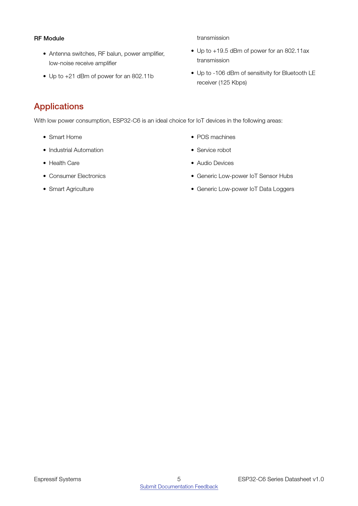 RF Module transmission • Up to +19.5 dBm of power for an 802.11ax • Antenna switches, RF balun, power amplifier, transmission low-noise receive amplifier • Up to -106 dBm of sensitivity for Bluetooth LE • Up to +21 dBm of power for an 802.11b receiver (125 Kbps) Applications With low power consumption, ESP32-C6 is an ideal choice for IoT devices in the following areas: • Smart Home • POS machines • Industrial Automation • Service robot • Health Care • Audio Devices • Consumer Electronics • Generic Low-power IoT Sensor Hubs • Smart Agriculture • Generic Low-power IoT Data Loggers Espressif Systems 5 ESP32-C6 Series Datasheet v1.0 Submit Documentation Feedback Document Outline Product Overview Features Applications 1 ESP32-C6 Series Comparison 1.1 Nomenclature 1.2 Comparison 2 Pins 2.1 Pin Layout 2.2 Pin Overview 2.3 IO Pins 2.3.1 IO MUX and GPIO Pin Functions 2.3.2 LP IO MUX Functions 2.3.3 Analog Functions 2.3.4 Restrictions for GPIOs and LP GPIOs 2.4 Analog Pins 2.5 Power Supply 2.5.1 Power Pins 2.5.2 Power Scheme 2.5.3 Chip Power-up and Reset 2.6 Strapping Pins 2.6.1 SDIO Sampling and Driving Clock Edge Control 2.6.2 Chip Boot Mode Control 2.6.3 ROM Messages Printing Control 2.6.4 JTAG Signal Source Control 2.7 Pin Mapping Between Chip and Flash 3 Functional Description 3.1 CPU and Memory 3.1.1 HP CPU 3.1.2 LP CPU 3.1.3 Internal Memory 3.1.4 Off-package Flash 3.1.5 Address Mapping Structure 3.1.6 Cache 3.1.7 TEE Controller 3.1.8 Access Permission Management (APM) 3.1.9 Timeout Protection 3.2 System Clocks 3.2.1 CPU Clock 3.2.2 Low-Power Clocks 3.3 Analog Peripherals 3.3.1 Analog-to-Digital Converter (ADC) 3.3.2 Temperature Sensor 3.4 Digital Peripherals 3.4.1 Universal Asynchronous Receiver Transmitter (UART) 3.4.2 Serial Peripheral Interface (SPI) 3.4.3 I2C Interface 3.4.4 I2S Interface 3.4.5 Pulse Count Controller (PCNT) 3.4.6 USB Serial/JTAG Controller 3.4.7 TWAI Controller 3.4.8 SDIO 2.0 Slave Controller 3.4.9 LED PWM Controller 3.4.10 Motor Control PWM (MCPWM) 3.4.11 Remote Control Peripheral 3.4.12 Parallel IO (PARLIO) Controller 3.4.13 General DMA Controller (GDMA) 3.4.14 Event Task Matrix (ETM) 3.5 Radio 3.5.1 2.4 GHz Receiver 3.5.2 2.4 GHz Transmitter 3.5.3 Clock Generator 3.6 Wi-Fi 3.6.1 Wi-Fi Radio and Baseband 3.6.2 Wi-Fi MAC 3.6.3 Networking Features 3.7 Bluetooth LE 3.7.1 Bluetooth LE PHY 3.7.2 Bluetooth LE Link Controller 3.8 802.15.4 3.8.1 802.15.4 PHY 3.8.2 802.15.4 MAC 3.9 Low Power Management 3.10 Timers 3.10.1 System Timer 3.10.2 General Purpose Timers 3.10.3 Watchdog Timers 3.11 Cryptography/Security Components 3.11.1 AES Accelerator (AES) 3.11.2 ECC Accelerator (ECC) 3.11.3 HMAC Accelerator (HMAC) 3.11.4 RSA Accelerator (RSA) 3.11.5 SHA Accelerator (SHA) 3.11.6 Digital Signature (DS) 3.11.7 External Memory Encryption and Decryption (XTS_AES) 3.11.8 Random Number Generator (RNG) 3.12 Peripheral Pin Configurations 4 Electrical Characteristics 4.1 Absolute Maximum Ratings 4.2 Recommended Power Supply Characteristics 4.3 VDD_SPI Output Characteristics 4.4 DC Characteristics (3.3 V, 25 °C) 4.5 ADC Characteristics 4.6 Current Consumption 4.6.1 RF Current Consumption in Active Mode 4.6.2 Current Consumption in Other Modes 4.7 Reliability 5 RF Characteristics 5.1 Wi-Fi Radio 5.1.1 Wi-Fi RF Transmitter (TX) Characteristics 5.1.2 Wi-Fi RF Receiver (RX) Characteristics 5.2 Bluetooth LE Radio 5.2.1 Bluetooth LE RF Transmitter (TX) Characteristics 5.2.2 Bluetooth LE RF Receiver (RX) Characteristics 5.3 802.15.4 Radio 5.3.1 802.15.4 RF Transmitter (TX) Characteristics 5.3.2 802.15.4 RF Receiver (RX) Characteristics 6 Packaging 7 Related Documentation and Resources Appendix A – ESP32-C6 Consolidated Pin Overview Revision History