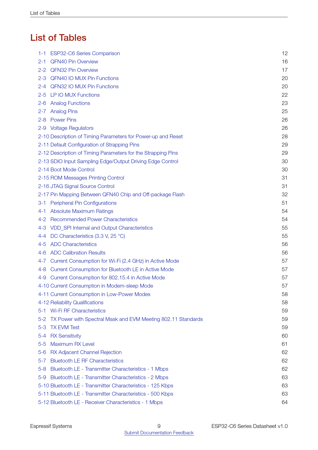 link to page 12 link to page 16 link to page 17 link to page 20 link to page 20 link to page 22 link to page 22 link to page 25 link to page 26 link to page 26 link to page 28 link to page 29 link to page 29 link to page 30 link to page 30 link to page 31 link to page 31 link to page 32 link to page 51 link to page 54 link to page 54 link to page 55 link to page 55 link to page 56 link to page 56 link to page 56 link to page 57 link to page 57 link to page 57 link to page 58 link to page 58 link to page 59 link to page 59 link to page 59 link to page 60 link to page 61 link to page 61 link to page 62 link to page 62 link to page 62 link to page 63 link to page 63 link to page 64 List of Tables List of Tables 1-1 ESP32-C6 Series Comparison 12 2-1 QFN40 Pin Overview 16 2-2 QFN32 Pin Overview 17 2-3 QFN40 IO MUX Pin Functions 20 2-4 QFN32 IO MUX Pin Functions 20 2-5 LP IO MUX Functions 22 2-6 Analog Functions 23 2-7 Analog Pins 25 2-8 Power Pins 26 2-9 Voltage Regulators 26 2-10 Description of Timing Parameters for Power-up and Reset 28 2-11 Default Configuration of Strapping Pins 29 2-12 Description of Timing Parameters for the Strapping Pins 29 2-13 SDIO Input Sampling Edge/Output Driving Edge Control 30 2-14 Boot Mode Control 30 2-15 ROM Messages Printing Control 31 2-16 JTAG Signal Source Control 31 2-17 Pin Mapping Between QFN40 Chip and Off-package Flash 32 3-1 Peripheral Pin Configurations 51 4-1 Absolute Maximum Ratings 54 4-2 Recommended Power Characteristics 54 4-3 VDD_SPI Internal and Output Characteristics 55 4-4 DC Characteristics (3.3 V, 25 °C) 55 4-5 ADC Characteristics 56 4-6 ADC Calibration Results 56 4-7 Current Consumption for Wi-Fi (2.4 GHz) in Active Mode 57 4-8 Current Consumption for Bluetooth LE in Active Mode 57 4-9 Current Consumption for 802.15.4 in Active Mode 57 4-10 Current Consumption in Modem-sleep Mode 57 4-11 Current Consumption in Low-Power Modes 58 4-12 Reliability Qualifications 58 5-1 Wi-Fi RF Characteristics 59 5-2 TX Power with Spectral Mask and EVM Meeting 802.11 Standards 59 5-3 TX EVM Test 59 5-4 RX Sensitivity 60 5-5 Maximum RX Level 61 5-6 RX Adjacent Channel Rejection 62 5-7 Bluetooth LE RF Characteristics 62 5-8 Bluetooth LE - Transmitter Characteristics - 1 Mbps 62 5-9 Bluetooth LE - Transmitter Characteristics - 2 Mbps 63 5-10 Bluetooth LE - Transmitter Characteristics - 125 Kbps 63 5-11 Bluetooth LE - Transmitter Characteristics - 500 Kbps 63 5-12 Bluetooth LE - Receiver Characteristics - 1 Mbps 64 Espressif Systems 9 ESP32-C6 Series Datasheet v1.0 Submit Documentation Feedback Document Outline Product Overview Features Applications 1 ESP32-C6 Series Comparison 1.1 Nomenclature 1.2 Comparison 2 Pins 2.1 Pin Layout 2.2 Pin Overview 2.3 IO Pins 2.3.1 IO MUX and GPIO Pin Functions 2.3.2 LP IO MUX Functions 2.3.3 Analog Functions 2.3.4 Restrictions for GPIOs and LP GPIOs 2.4 Analog Pins 2.5 Power Supply 2.5.1 Power Pins 2.5.2 Power Scheme 2.5.3 Chip Power-up and Reset 2.6 Strapping Pins 2.6.1 SDIO Sampling and Driving Clock Edge Control 2.6.2 Chip Boot Mode Control 2.6.3 ROM Messages Printing Control 2.6.4 JTAG Signal Source Control 2.7 Pin Mapping Between Chip and Flash 3 Functional Description 3.1 CPU and Memory 3.1.1 HP CPU 3.1.2 LP CPU 3.1.3 Internal Memory 3.1.4 Off-package Flash 3.1.5 Address Mapping Structure 3.1.6 Cache 3.1.7 TEE Controller 3.1.8 Access Permission Management (APM) 3.1.9 Timeout Protection 3.2 System Clocks 3.2.1 CPU Clock 3.2.2 Low-Power Clocks 3.3 Analog Peripherals 3.3.1 Analog-to-Digital Converter (ADC) 3.3.2 Temperature Sensor 3.4 Digital Peripherals 3.4.1 Universal Asynchronous Receiver Transmitter (UART) 3.4.2 Serial Peripheral Interface (SPI) 3.4.3 I2C Interface 3.4.4 I2S Interface 3.4.5 Pulse Count Controller (PCNT) 3.4.6 USB Serial/JTAG Controller 3.4.7 TWAI Controller 3.4.8 SDIO 2.0 Slave Controller 3.4.9 LED PWM Controller 3.4.10 Motor Control PWM (MCPWM) 3.4.11 Remote Control Peripheral 3.4.12 Parallel IO (PARLIO) Controller 3.4.13 General DMA Controller (GDMA) 3.4.14 Event Task Matrix (ETM) 3.5 Radio 3.5.1 2.4 GHz Receiver 3.5.2 2.4 GHz Transmitter 3.5.3 Clock Generator 3.6 Wi-Fi 3.6.1 Wi-Fi Radio and Baseband 3.6.2 Wi-Fi MAC 3.6.3 Networking Features 3.7 Bluetooth LE 3.7.1 Bluetooth LE PHY 3.7.2 Bluetooth LE Link Controller 3.8 802.15.4 3.8.1 802.15.4 PHY 3.8.2 802.15.4 MAC 3.9 Low Power Management 3.10 Timers 3.10.1 System Timer 3.10.2 General Purpose Timers 3.10.3 Watchdog Timers 3.11 Cryptography/Security Components 3.11.1 AES Accelerator (AES) 3.11.2 ECC Accelerator (ECC) 3.11.3 HMAC Accelerator (HMAC) 3.11.4 RSA Accelerator (RSA) 3.11.5 SHA Accelerator (SHA) 3.11.6 Digital Signature (DS) 3.11.7 External Memory Encryption and Decryption (XTS_AES) 3.11.8 Random Number Generator (RNG) 3.12 Peripheral Pin Configurations 4 Electrical Characteristics 4.1 Absolute Maximum Ratings 4.2 Recommended Power Supply Characteristics 4.3 VDD_SPI Output Characteristics 4.4 DC Characteristics (3.3 V, 25 °C) 4.5 ADC Characteristics 4.6 Current Consumption 4.6.1 RF Current Consumption in Active Mode 4.6.2 Current Consumption in Other Modes 4.7 Reliability 5 RF Characteristics 5.1 Wi-Fi Radio 5.1.1 Wi-Fi RF Transmitter (TX) Characteristics 5.1.2 Wi-Fi RF Receiver (RX) Characteristics 5.2 Bluetooth LE Radio 5.2.1 Bluetooth LE RF Transmitter (TX) Characteristics 5.2.2 Bluetooth LE RF Receiver (RX) Characteristics 5.3 802.15.4 Radio 5.3.1 802.15.4 RF Transmitter (TX) Characteristics 5.3.2 802.15.4 RF Receiver (RX) Characteristics 6 Packaging 7 Related Documentation and Resources Appendix A – ESP32-C6 Consolidated Pin Overview Revision History