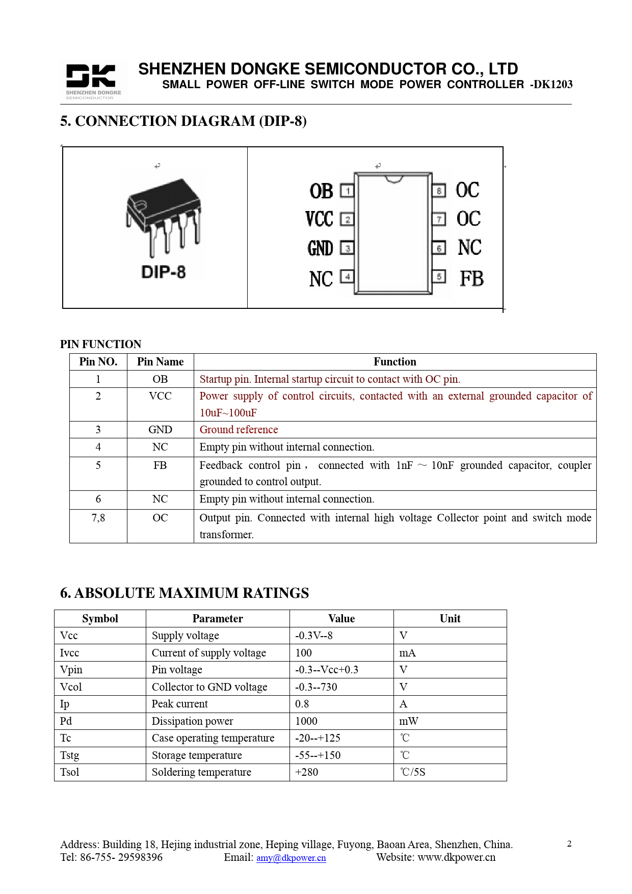 SHENZHEN DONGKE SEMICONDUCTOR CO., LTDSMALL POWER OFF-LINE SWITCH MODE POWER CONTROLLER -DK12035. CONNECTION DIAGRAM (DIP-8)PIN FUNCTIONPin NO.Pin NameFunction 1 OB Startup pin. Internal startup circuit to contact with OC pin. 2 VCC Power supply of control circuits, contacted with an external grounded capacitor of 10uF~100uF 3 GND Ground reference 4 NC Empty pin without internal connection. 5 FB Feedback control pin , connected with 1nF ~ 10nF grounded capacitor, coupler grounded to control output. 6 NC Empty pin without internal connection. 7,8 OC Output pin. Connected with internal high voltage Collector point and switch mode transformer. 6. ABSOLUTE MAXIMUM RATINGSSymbolParameterValueUnit Vcc Supply voltage -0.3V--8 V Ivcc Current of supply voltage 100 mA Vpin Pin voltage -0.3--Vcc+0.3 V Vcol Collector to GND voltage -0.3--730 V Ip Peak current 0.8 A Pd Dissipation power 1000 mW Tc Case operating temperature -20--+125 ℃ Tstg Storage temperature -55--+150 ℃ Tsol Soldering temperature +280 ℃/5S Address: Building 18, Hejing industrial zone, Heping village, Fuyong, Baoan Area, Shenzhen, China. 2 Tel: 86-755- 29598396 Email: amy@dkpower.cn Website: www.dkpower.cn