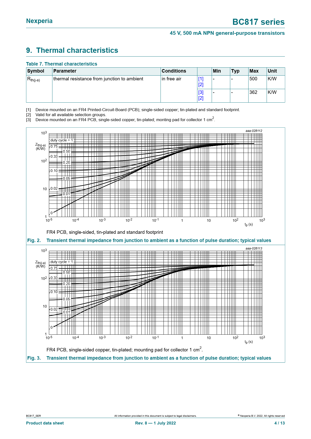 Nexperia BC817 series 45 V, 500 mA NPN general-purpose transistors 9. Thermal characteristics Table 7. Thermal characteristics Symbol Parameter Conditions Min Typ Max Unit