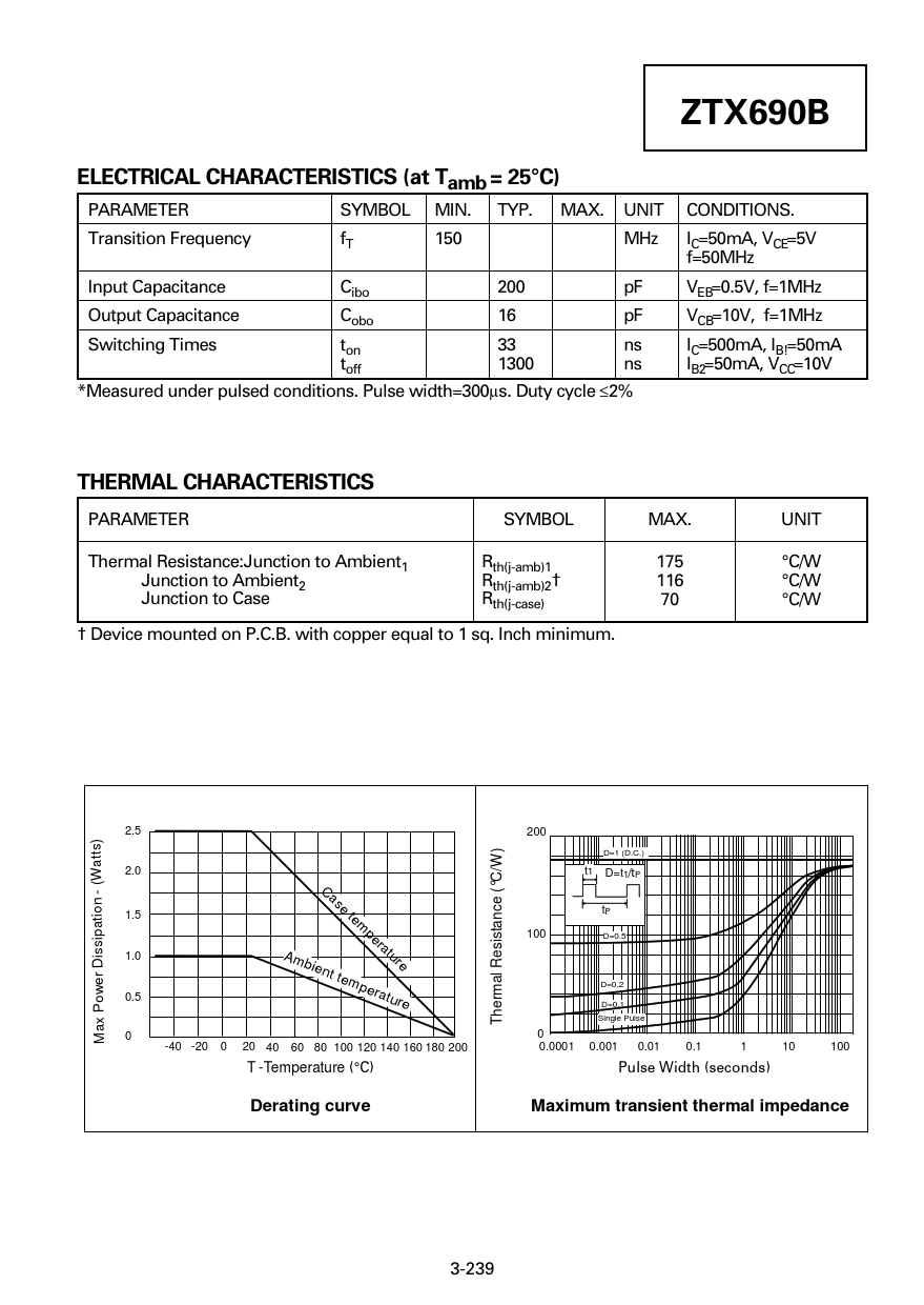 BE(sat) 0.9 V IC=1A, IB=10mA* Saturation Voltage Base-Emitter VBE(on) 0.9 V IC=1A, VCE=2V* Turn-On Voltage Static Forward Current hFE 500 IC=100mA, VCE=2V* Transfer Ratio 400 IC=1A, VCE=2V* 150 IC=2A, VCE=2V* 3-239 3-238