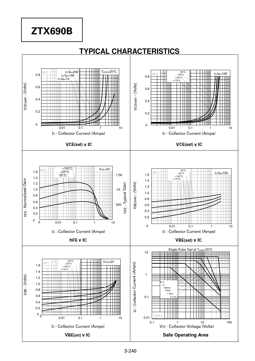 ZTX690B TYPICAL CHARACTERISTICS IC/IB=200 Tamb=25°C -55°C 0.8 +25°C IC/IB=100 IC/IB=100 0.8 +100°C IC/IB=10 +175°C 0.6 olts) olts) 0.6 - (V - (V ) t )t a 0.4 a 0.4 (s (s E E C C V 0.2 V 0.2 0 0 0.01 0.1 1 10 0.01 0.1 1 10 IC - Collector Current (Amps) IC - Collector Current (Amps) VCE(sat) v ICVCE(sat) v IC +100°C VCE=2V 1.6 +25°C -55°C +25°C IC/IB=100 -55°C 1.5K 1.6 +100°C 1.4 +175°C 1.4 ) 1.2 lts 1.2 o 1.0 1K V ( 1.0 0.8 - )ta 0.8 0.6 ypical Gain (s E 500 - T 0.6 B 0.4 - Normalised Gain E F V 0.4 E h F 0.2 h 0.2 0 0 0.01 0.1 1 10 0 0.01 0.1 1 10 IC - Collector Current (Amps) IC - Collector Current (Amps) hFE v ICVBE(sat) v IC Single Pulse Test at Tamb=25°C 10 -55°C VCE=2V +25°C 1.6 +100°C ps) +175°C 1.4 Am ( 1 1.2 nt olts) er D.C. 1.0 1s - (V 100ms E 0.8 Curr B 10ms V to 1.0ms 0.6 c 0.1ms le 0.1 l 0.4 Co 0.2 - C I 0 0 0.01 0.1 1 10 0.01 0.1 1 10 100 IC - Collector Current (Amps) VCE - Collector Voltage (Volts) VBE(on) v ICSafe Operating Area 3-240