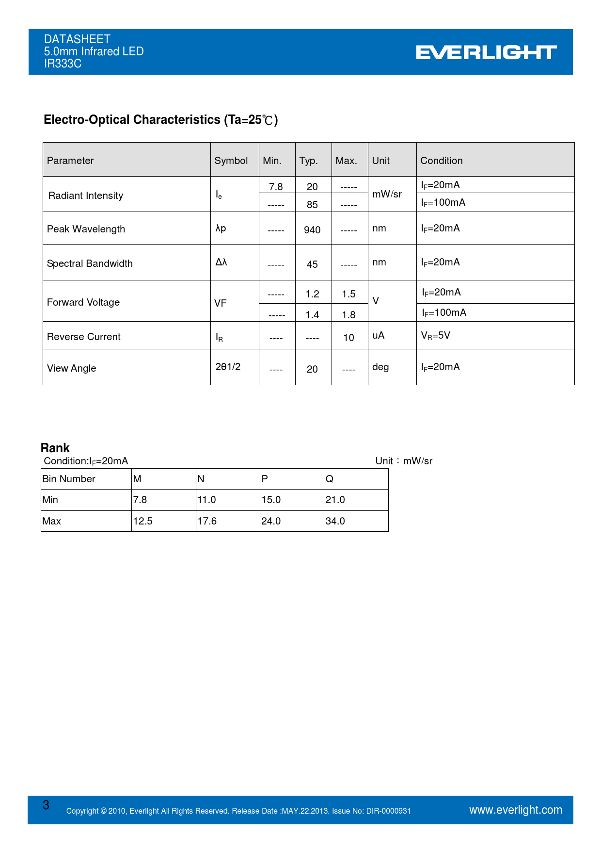 Condition:IF=20mA Unit:mW/sr Bin Number M N P Q Min 7.8 11.0 15.0 21.0 Max 12.5 17.6 24.0 34.0 3 Copyright © 2010, Everlight All Rights Reserved. Release Date :MAY.22.2013. Issue No: DIR-0000931 www.everlight.com