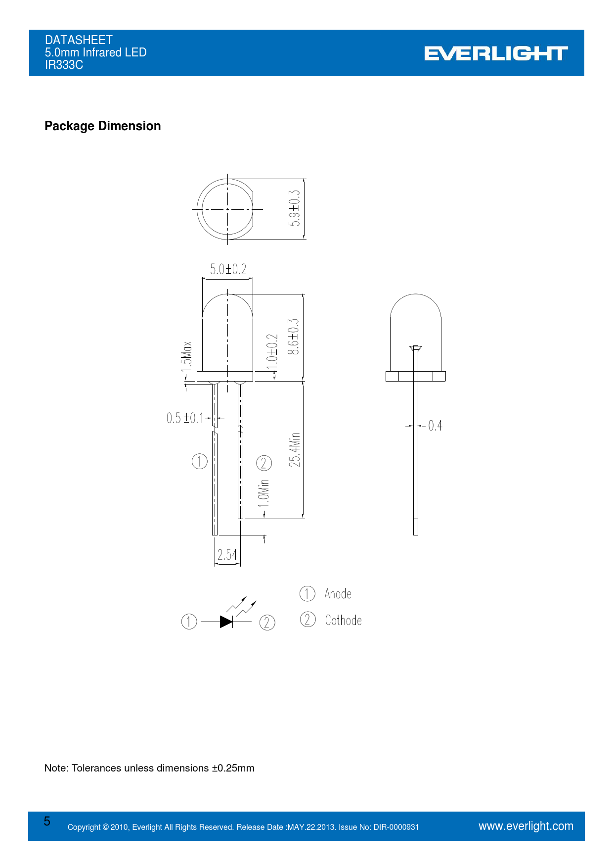 Note: Tolerances unless dimensions ±0.25mm 5 Copyright © 2010, Everlight All Rights Reserved. Release Date :MAY.22.2013. Issue No: DIR-0000931 www.everlight.com