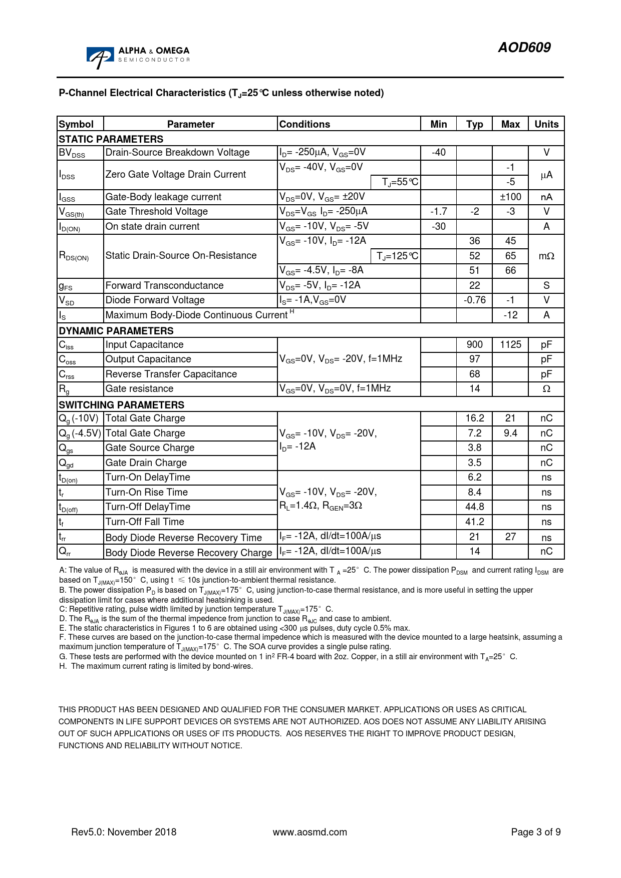 AOD609 P-Channel Electrical Characteristics (TJ=25°C unless otherwise noted) Symbol Parameter Conditions Min Typ Max Units
