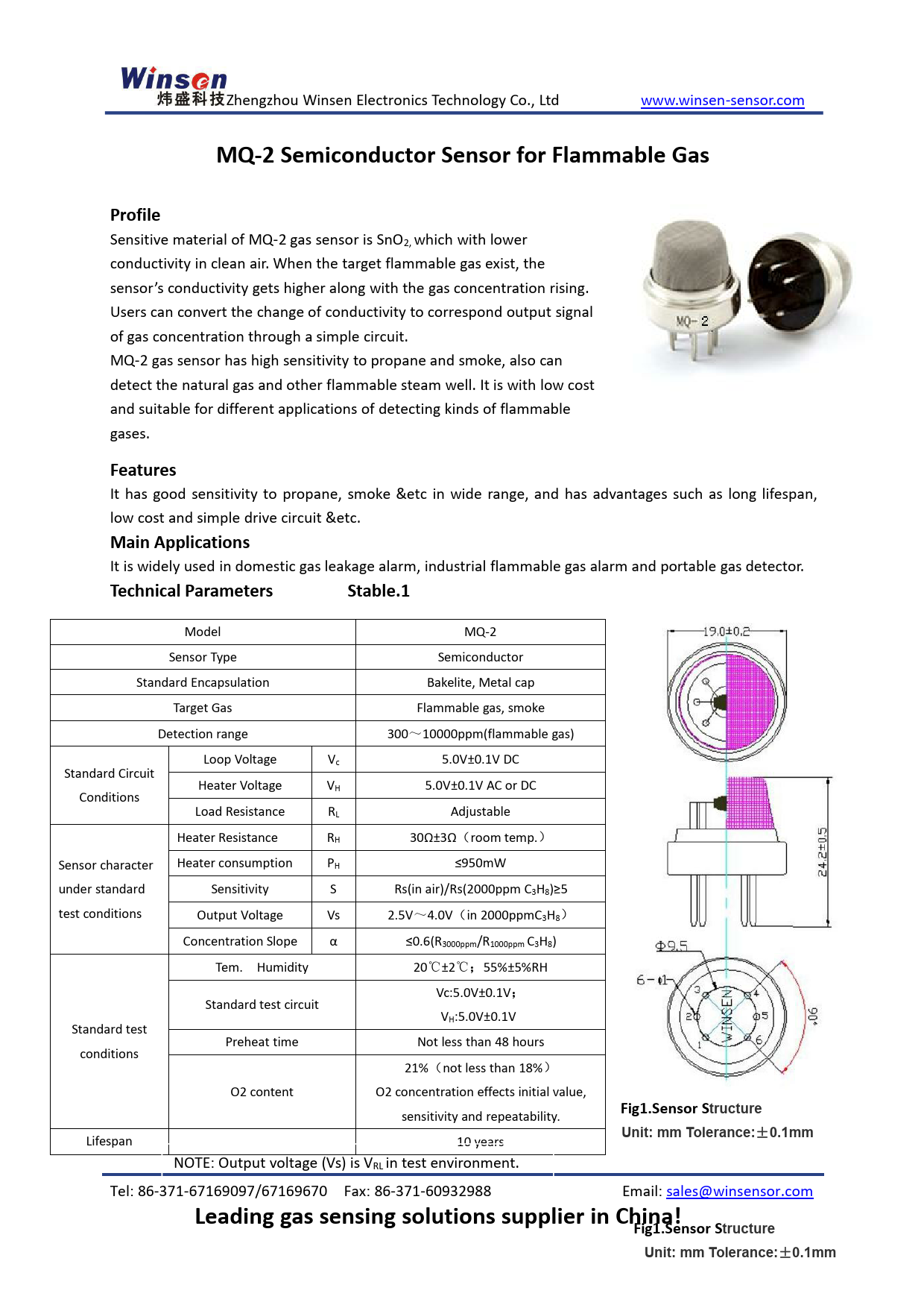 Zhengzhou Winsen Electronics Technology Co., Ltd www.winsen-sensor.com MQ-2 Semiconductor Sensor for Flammable GasProfile Sensitive material of MQ-2 gas sensor is SnO2, which with lower conductivity in clean air. When the target flammable gas exist, the sensor’s conductivity gets higher along with the gas concentration rising. Users can convert the change of conductivity to correspond output signal of gas concentration through a simple circuit. MQ-2 gas sensor has high sensitivity to propane and smoke, also can detect the natural gas and other flammable steam wel . It is with low cost and suitable for different applications of detecting kinds of flammable gases. Features It has good sensitivity to propane, smoke &etc in wide range, and has advantages such as long lifespan, low cost and simple drive circuit &etc. Main Applications It is widely used in domestic gas leakage alarm, industrial flammable gas alarm and portable gas detector. Technical ParametersStable.1 Model MQ-2 Sensor Type Semiconductor Standard Encapsulation Bakelite, Metal cap Target Gas Flammable gas, smoke Detection range 300~10000ppm(flammable gas) Loop Voltage Vc 5.0V±0.1V DC Standard Circuit Heater Voltage V Conditions H 5.0V±0.1V AC or DC Load Resistance RL Adjustable Heater Resistance RH 30Ω±3Ω(room temp.) Sensor character Heater consumption PH ≤950mW under standard Sensitivity S Rs(in air)/Rs(2000ppm C3H8)≥5 test conditions Output Voltage Vs 2.5V~4.0V(in 2000ppmC3H8) Concentration Slope α ≤0.6(R3000ppm/R1000ppm C3H8) Tem. Humidity 20℃±2℃;55%±5%RH Vc:5.0V±0.1V; Standard test circuit VH:5.0V±0.1V Standard test Preheat time Not less than 48 hours conditions 21%(not less than 18%) O2 content O2 concentration effects initial value, Fig1.Sensor Structure sensitivity and repeatability. Unit: mm Tolerance: ± 0.1mm Lifespan 10 years NOTE: Output voltage (Vs) is VRL in test environment. Tel: 86-371-67169097/67169670 Fax: 86-371-60932988 Email: sales@winsensor.com Leading gas sensing solutions supplier in China!Fig1.Sensor StructureUnit: mm Tolerance: ± 0.1mm Document Outline Flammable Gas Sensor Instructions: The above fig is the basic test circ Resistance of Sensitive materials (Rs)=(Vc/VRL-1)× Power consumption of Sensitive materials (Ps)=Vc2×