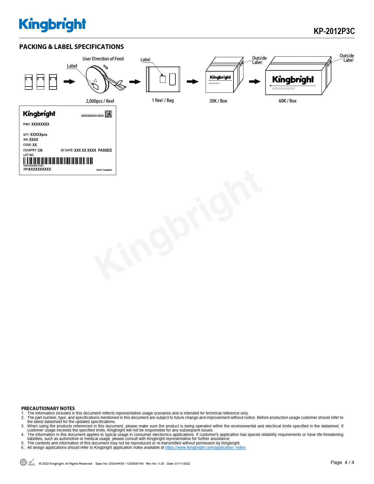 | 页数 / 页 | 4 / 4 — KP-2012P3C. PACKING & LABEL SPECIFICATIONS. Kingbright. PRECAUTIONARY … |