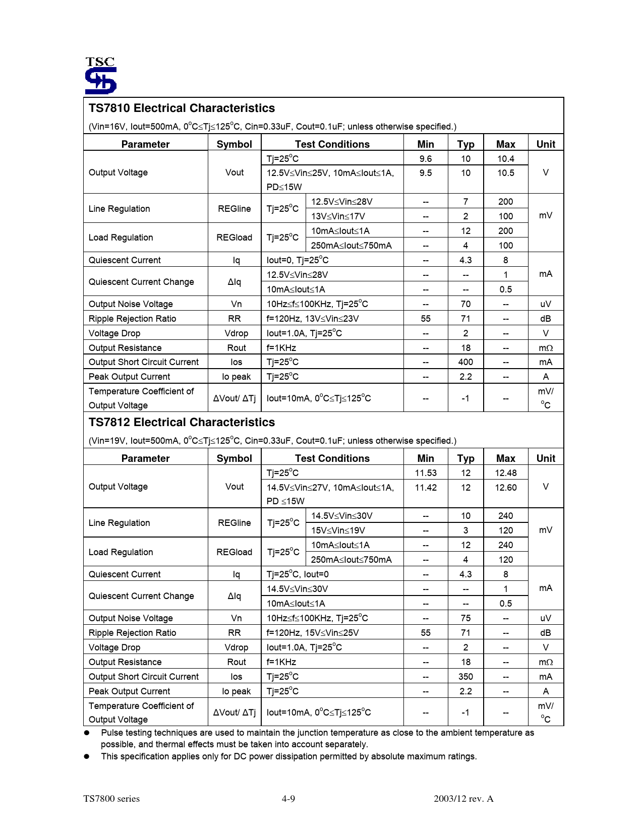 TS7810 Electrical Characteristics Parameter Symbol Test Conditions Min Typ Max Unit TS7812 Electrical Characteristics