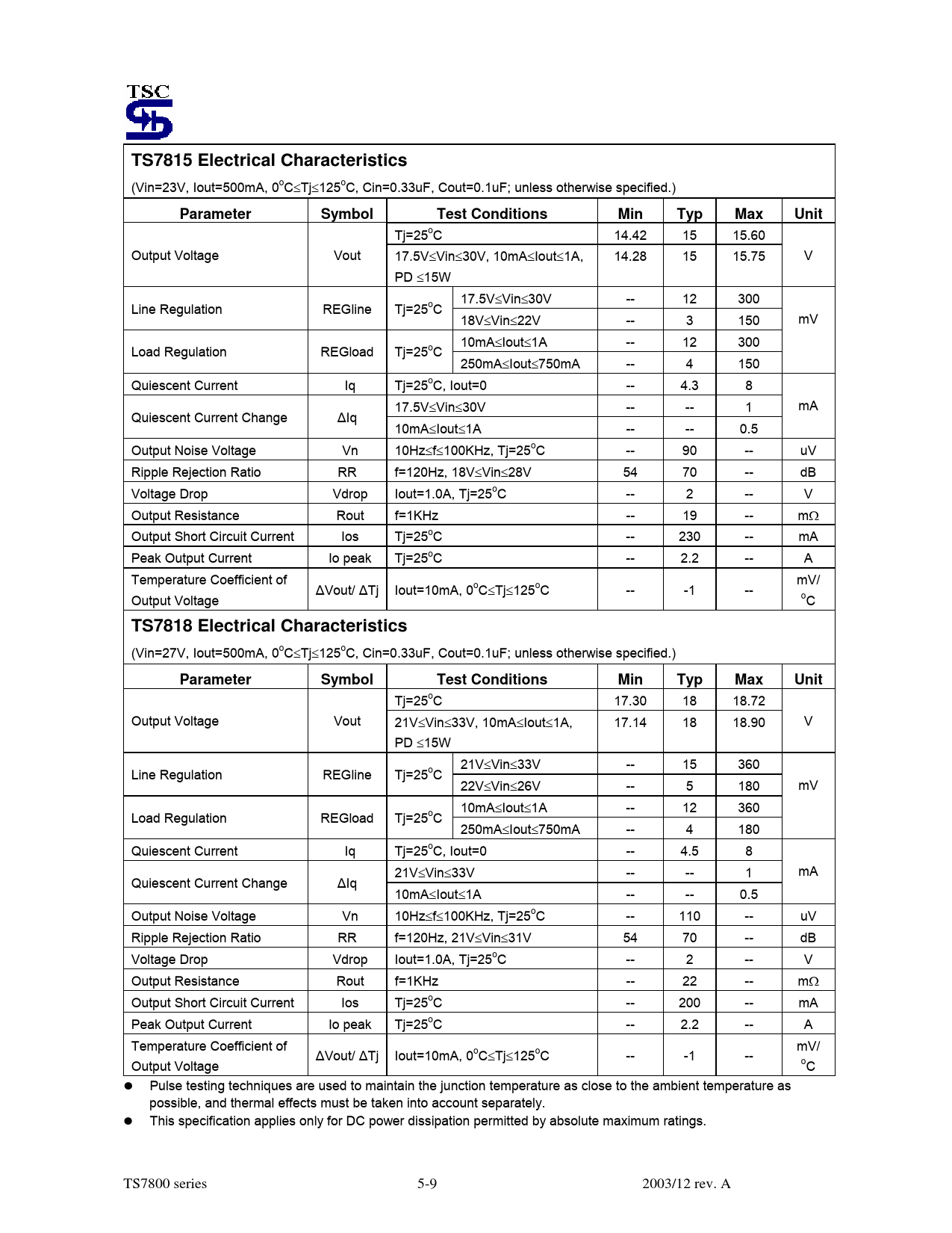 TS7815 Electrical Characteristics (Vin=23V, Iout=500mA, 0oC≤Tj≤125oC, Cin=0.33uF, Cout=0.1uF; unless otherwise specified.) Parameter Symbol TestConditions MinTypMaxUnit Tj=25oC 14.42 15 15.60 Output Voltage Vout 17.5V≤Vin≤30V, 10mA≤Iout≤1A, 14.28 15 15.75 V PD ≤15W 17.5V≤Vin≤30V -- 12 300 Line Regulation REGline Tj=25oC 18V≤Vin≤22V -- 3 150 mV 10mA≤Iout≤1A -- 12 300 Load Regulation REGload Tj=25oC 250mA≤Iout≤750mA -- 4 150 Quiescent Current Iq Tj=25oC, Iout=0 -- 4.3 8 17.5V≤Vin≤30V -- -- 1 mA Quiescent Current Change ∆Iq 10mA≤Iout≤1A -- -- 0.5 Output Noise Voltage Vn 10Hz≤f≤100KHz, Tj=25oC -- 90 -- uV Ripple Rejection Ratio RR f=120Hz, 18V≤Vin≤28V 54 70 -- dB Voltage Drop Vdrop Iout=1.0A, Tj=25oC -- 2 -- V Output Resistance Rout f=1KHz -- 19 -- mΩ Output Short Circuit Current Ios Tj=25oC -- 230 -- mA Peak Output Current Io peak Tj=25oC -- 2.2 -- A Temperature Coefficient of mV/ ∆Vout/ ∆Tj Iout=10mA, 0oC≤Tj≤125oC -- -1 -- Output Voltage oC TS7818 Electrical Characteristics (Vin=27V, Iout=500mA, 0oC≤Tj≤125oC, Cin=0.33uF, Cout=0.1uF; unless otherwise specified.) Parameter Symbol TestConditions MinTypMaxUnit Tj=25oC 17.30 18 18.72 Output Voltage Vout 21V≤Vin≤33V, 10mA≤Iout≤1A, 17.14 18 18.90 V PD ≤15W 21V≤Vin≤33V -- 15 360 Line Regulation REGline Tj=25oC 22V≤Vin≤26V -- 5 180 mV 10mA≤Iout≤1A -- 12 360 Load Regulation REGload Tj=25oC 250mA≤Iout≤750mA -- 4 180 Quiescent Current Iq Tj=25oC, Iout=0 -- 4.5 8 21V≤Vin≤33V -- -- 1 mA Quiescent Current Change ∆Iq 10mA≤Iout≤1A -- -- 0.5 Output Noise Voltage Vn 10Hz≤f≤100KHz, Tj=25oC -- 110 -- uV Ripple Rejection Ratio RR f=120Hz, 21V≤Vin≤31V 54 70 -- dB Voltage Drop Vdrop Iout=1.0A, Tj=25oC -- 2 -- V Output Resistance Rout f=1KHz -- 22 -- mΩ Output Short Circuit Current Ios Tj=25oC -- 200 -- mA Peak Output Current Io peak Tj=25oC -- 2.2 -- A Temperature Coefficient of mV/ ∆Vout/ ∆Tj Iout=10mA, 0oC≤Tj≤125oC -- -1 -- Output Voltage oC z Pulse testing techniques are used to maintain the junction temperature as close to the ambient temperature as possible, and thermal effects must be taken into account separately. z This specification applies only for DC power dissipation permitted by absolute maximum ratings. TS7800 series 5-9 2003/12 rev. A