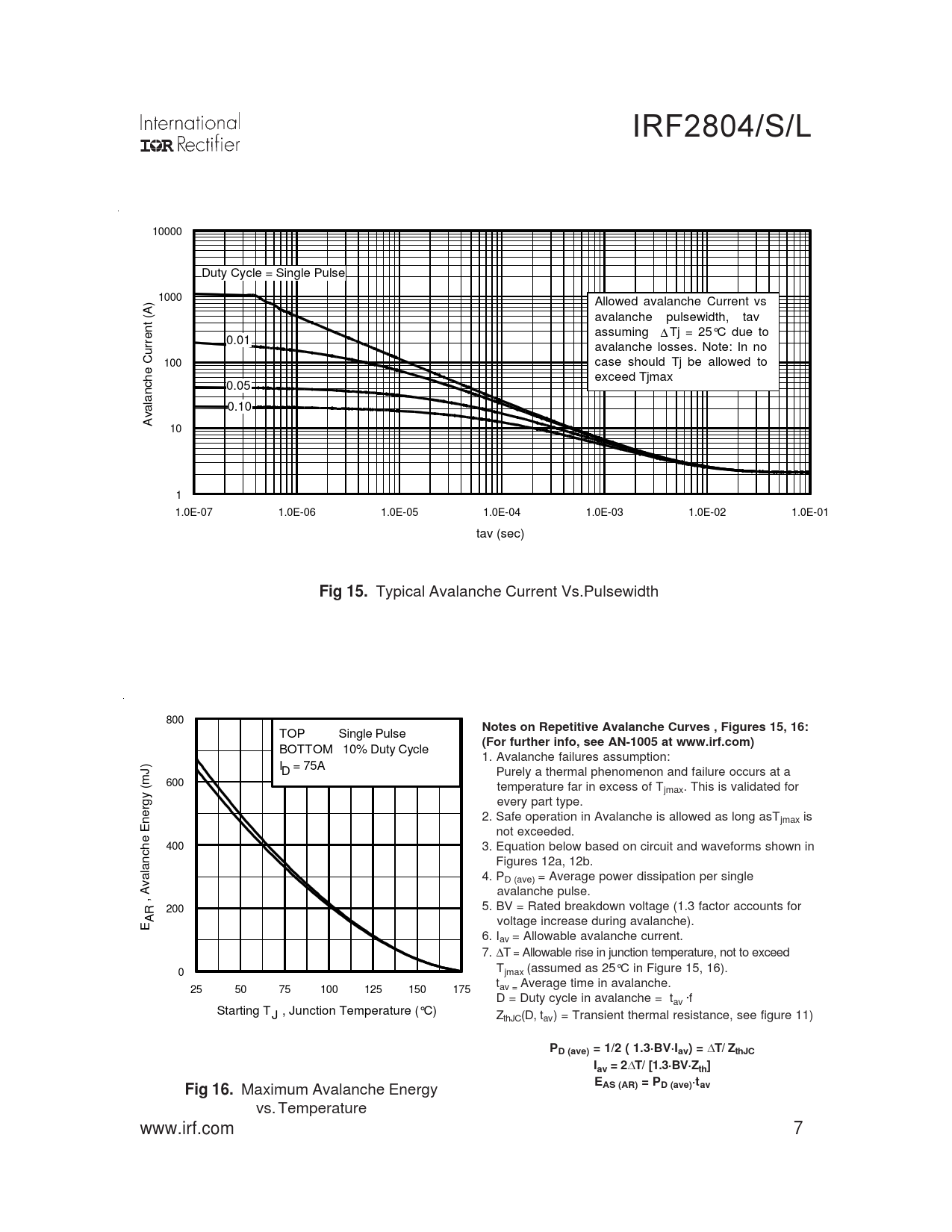 IRF2804/S/L 10000 Duty Cycle = Single Pulse 1000 ) Allowed avalanche Current vs A( t avalanche pulsewidth, tav n e assuming ∆ Tj = 25°C due to rr 0.01 u avalanche losses. Note: In no C 100 case should Tj be allowed to e h exceed Tjmax c n 0.05 al a 0.10 v A 10 1 1.0E-07 1.0E-06 1.0E-05 1.0E-04 1.0E-03 1.0E-02 1.0E-01 tav (sec) Fig 15. Typical Avalanche Current Vs.Pulsewidth 800 Notes on Repetitive Avalanche Curves , Figures 15, 16: TOP Single Pulse (For further info, see AN-1005 at www.irf.com) BOTTOM 10% Duty Cycle 1. Avalanche failures assumption: ) J ID = 75A Purely a thermal phenomenon and failure occurs at a m 600 ( temperature far in excess of Tjmax. This is validated for y g every part type. r e 2. Safe operation in Avalanche is allowed as long asT n jmax is E not exceeded. e h 400 3. Equation below based on circuit and waveforms shown in c n Figures 12a, 12b. al a 4. PD (ave) = Average power dissipation per single v A avalanche pulse. , 5. BV = Rated breakdown voltage (1.3 factor accounts for R 200 A voltage increase during avalanche). E 6. Iav = Allowable avalanche current. 7. ∆T = Allowable rise in junction temperature, not to exceed T 0 jmax (assumed as 25°C in Figure 15, 16). tav = Average time in avalanche. 25 50 75 100 125 150 175 D = Duty cycle in avalanche = tav ·f Starting TJ , Junction Temperature (°C) ZthJC(D, tav) = Transient thermal resistance, see figure 11) PD (ave) = 1/2 ( 1.3·BV·Iav) = D T/ ZthJCIav = 2 D T/ [1.3·BV·Zth]EFig 16. Maximum Avalanche Energy AS (AR) = PD (ave)·tav vs. Temperature www.irf.com 7