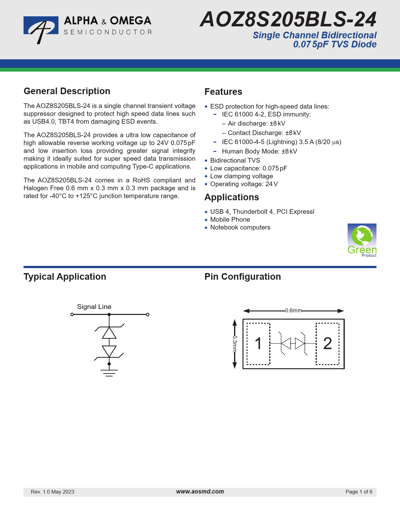 页数 / 页6 / 1 — AOZ8S205BLS-24. Single Channel Bidirectional. 0.07 5pF TVS Diode. General …