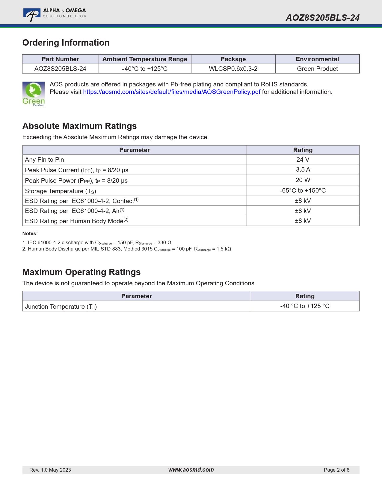 AOZ8S205BLS-24Ordering InformationPart NumberAmbient Temperature RangePackageEnvironmental AOZ8S205BLS-24 -40°C to +125°C WLCSP0.6x0.3-2 Green Product AOS products are offered in packages with Pb-free plating and compliant to RoHS standards. Please visit https:/ aosmd.com/sites/default/files/media/AOSGreenPolicy.pdf for additional information. Absolute Maximum Ratings Exceeding the Absolute Maximum Ratings may damage the device. ParameterRating Any Pin to Pin 24 V Peak Pulse Current (IPP), tP = 8/20 µs 3.5 A Peak Pulse Power (PPP), tP = 8/20 µs 20 W Storage Temperature (TS) -65°C to +150°C ESD Rating per IEC61000-4-2, Contact(1) ±8 kV ESD Rating per IEC61000-4-2, Air(1) ±8 kV ESD Rating per Human Body Mode(2) ±8 kV Notes: 1. IEC 61000-4-2 discharge with CDischarge = 150 pF, RDischarge = 330 Ω. 2. Human Body Discharge per MIL-STD-883, Method 3015 CDischarge = 100 pF, RDischarge = 1.5 kΩ Maximum Operating Ratings The device is not guaranteed to operate beyond the Maximum Operating Conditions. ParameterRating Junction Temperature (TJ) -40 °C to +125 °C Rev. 1.0 May 2023 www.aosmd.com Page 2 of 6