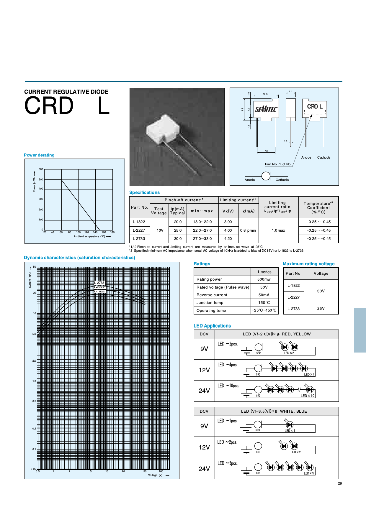 CURRENT REGULATIVE DIODE CRD 4.1 1.0 10.5 −L 9.8 7.3 1.5 後 送 分 0.5 Φ 7.6 + − Power derating Anode Cathode Part No. / Lot No. 600 + − 500 Anode Cathode (mW) 400 Power Specifications 300 Pinch-off current*1 Limiting current*2 Limiting Temperature*3 Part No. current ratio Coefficient 200 Test Ip(mA) m i n ⬃ m a x I100V/Ip*I30V/Ip ( Voltage Typical VK(V) IK(mA) % /⬚C) 100 L-1822 20.0 18.0⬃22.0 3.90 ⫺0.25 ⬃⫺0.45 0 L-2227 10V 25.0 22.0⬃27.0 4.00 0.8 Ipmin 1.0max ⫺0.25 ⬃⫺0.45 20 40 60 80 100 120 140 160 180 Ambient temperature (⬚C) L-2733 30.0 27.0⬃33.0 4.20 ⫺0.25 ⬃⫺0.45 *1,*2 Pinch-off current and Limiting current are measured by an impulse wave at 25⬚C *3Specified minimum AC impedance when small AC voltage of 10kHz is added to bias of DC15V for L-1822 to L-2733 Dynamic characteristics (saturation characteristics) Ratings Maximum rating voltage 50 L series Part No. Voltage (mA) Rating power 500mw L-2733 Current L-2227 Rated voltage (Pulse wave) 50V L-1822 L-1822 30V 20 Reverse current 50mA L-2227 Junction temp 150 ⬚C Operating temp ⫺25⬚C⬃150⬚C L-2733 25V 10 LED Applications 5.0 DCV LED (Vf=2.0[V])e.g. RED, YELLOW 9V 2.0 12V 1.0 24V 0.5 DCV LED (Vf=3.5[V])e.g. WHITE, BLUE 0.2 9V 0.1 12V 0.050.5 1 2 5 10 20 50 100 24V Voltage (V) 29