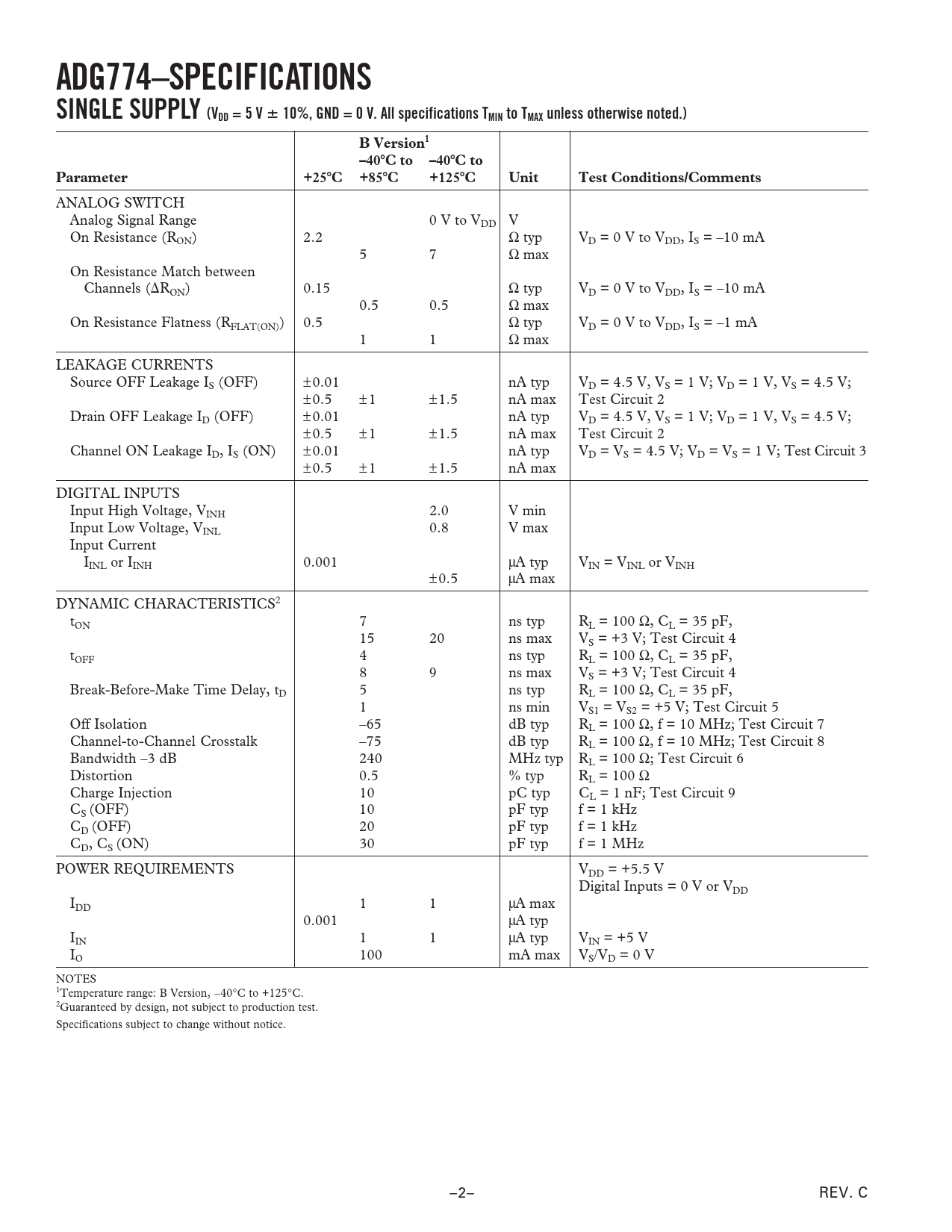 ADG774–SPECIFICATIONS SINGLE SUPPLY (VDD = 5 V 10%, GND = 0 V All specifications TMIN to TMAX unless otherwise noted.)
