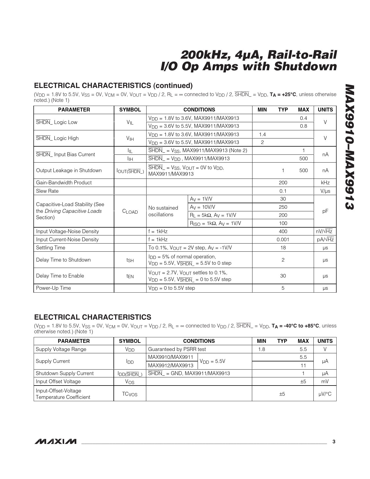 200kHz, 4µA, Rail-to-Rail. I/O Op Amps with Shutdown. MAX9910–MAX9913. ELECTRICAL CHARACTERISTICS (continued). TA = +25°C