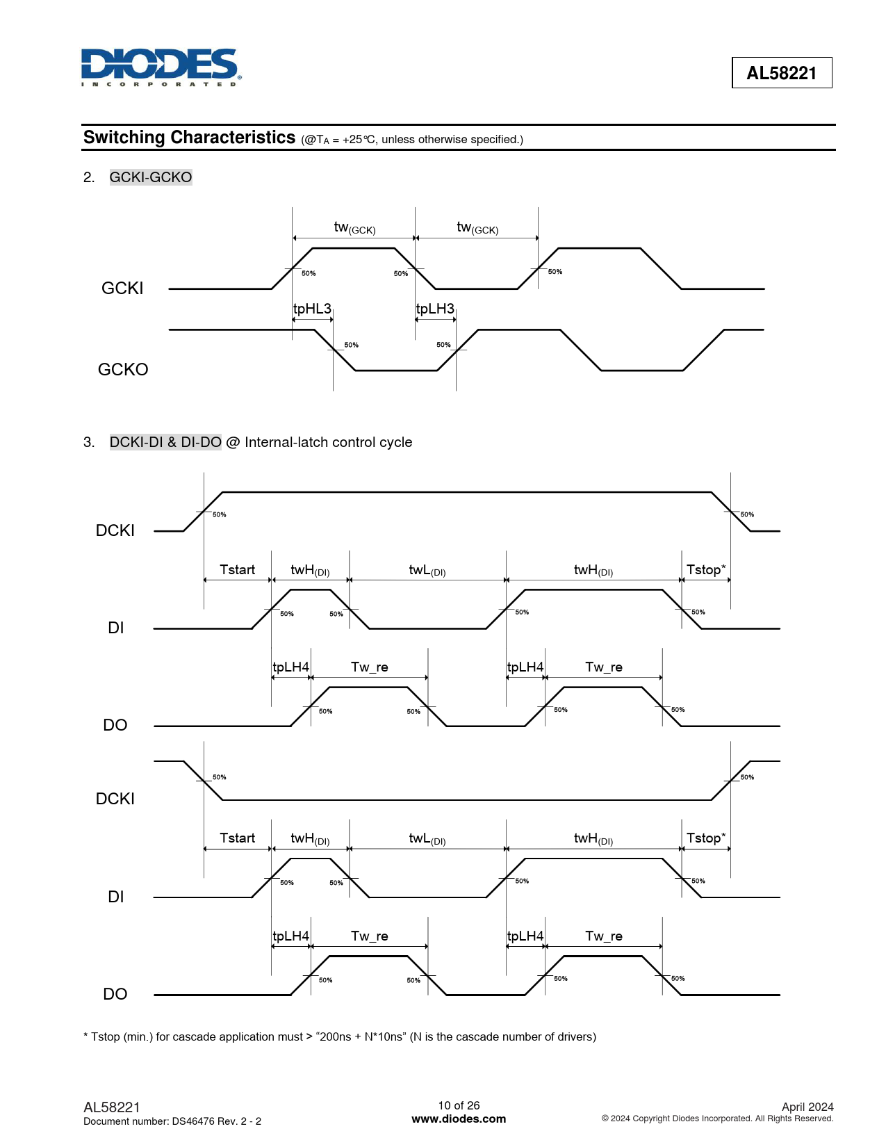 (@TA = +25°C, unless otherwise specified.) 2. GCKI-GCKO tw(GCK) tw(GCK) 50% 50% 50% GCKI tpHL3 tpLH3 50% 50% GCKO 3. DCKI-DI & DI-DO @ Internal-latch control cycle 50% 50% DCKI Tstart twH(DI) twL(DI) twH(DI) Tstop* 50% 50% 50% 50% DI tpLH4 Tw_re tpLH4 Tw_re 50% 50% 50% 50% DO 50% 50% DCKI Tstart twH(DI) twL(DI) twH(DI) Tstop* 50% 50% 50% 50% DI tpLH4 Tw_re tpLH4 Tw_re 50% 50% 50% 50% DO * Tstop (min.) for cascade application must > “200ns + N*10ns” (N is the cascade number of drivers) AL58221 10 of 26 April 2024 Document number: DS46476 Rev. 2 - 2