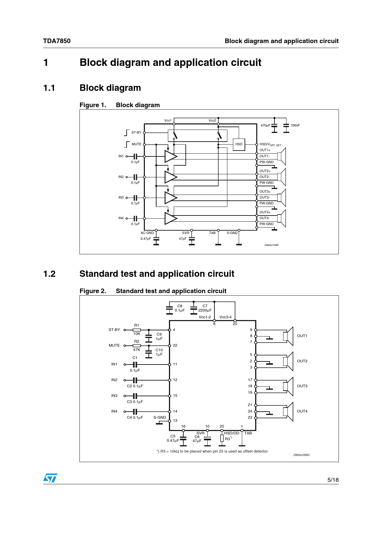 Vcc1 Vcc2 470μF 100nF ST-BY MUTE HSD HSD/VOFF_DET OUT1+ IN1 OUT1- 0.1μF PW-GND OUT2+ IN2 OUT2- 0.1μF PW-GND OUT3+ IN3 OUT3- 0.1μF PW-GND OUT4+ IN4 OUT4- 0.1μF PW-GND AC-GND SVR TAB S-GND 0.47μF 47μF D94AU158D