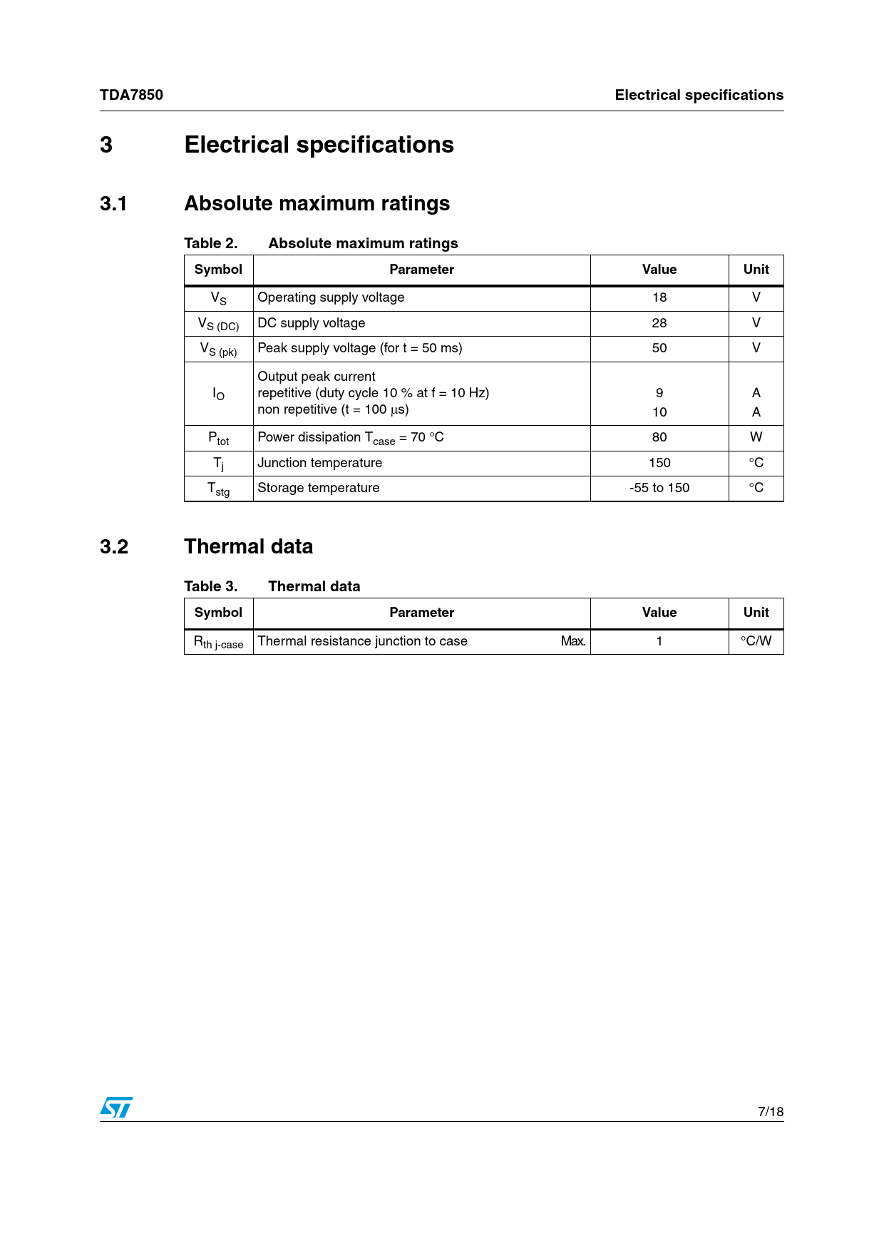 TDA7850. Electrical specifications. 3 Electrical. specifications. 3.1. Absolute maximum ratings. Table 2. Symbol. Parameter. Value. Unit