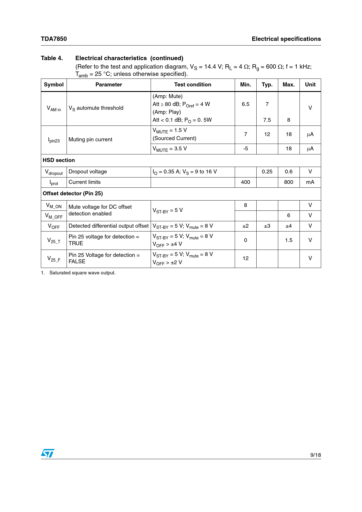 TDA7850Electrical specificationsTable 4.Electrical characteristics (continued) (Refer to the test and application diagram, VS = 14.4 V; RL = 4 ; Rg = 600 ; f = 1 kHz; Tamb = 25 °C; unless otherwise specified). SymbolParameterTest conditionMin.Typ.Max.Unit (Amp: Mute) Att 80 dB; P 6.5 7 V Oref = 4 W AM in VS automute threshold V (Amp: Play) Att < 0.1 dB; PO = 0. 5W 7.5 8 VMUTE = 1.5 V 7 12 18 A I (Sourced Current) pin23 Muting pin current VMUTE = 3.5 V -5 18 A HSD section Vdropout Dropout voltage IO = 0.35 A; VS = 9 to 16 V 0.25 0.6 V Iprot Current limits 400 800 mA Offset detector (Pin 25) VM_ON Mute voltage for DC offset 8 V V detection enabled ST-BY = 5 V VM_OFF 6 V VOFF Detected differential output offset VST-BY = 5 V; Vmute = 8 V ±2 ±3 ±4 V Pin 25 voltage for detection = V V ST-BY = 5 V; Vmute = 8 V 25_T 0 1.5 V TRUE VOFF > ±4 V Pin 25 Voltage for detection = V V ST-BY = 5 V; Vmute = 8 V 25_F 12 V FALSE VOFF > ±2 V 1. Saturated square wave output. 9/18 Document Outline Table 1. Device summary 1 Block diagram and application circuit 1.1 Block diagram Figure 1. Block diagram 1.2 Standard test and application circuit Figure 2. Standard test and application circuit 2 Pin description Figure 3. Pin connection (top view) 3 Electrical specifications 3.1 Absolute maximum ratings Table 2. Absolute maximum ratings 3.2 Thermal data Table 3. Thermal data 3.3 Electrical characteristics Table 4. Electrical characteristics Figure 4. Components and top copper layer of the Figure 2. Figure 5. Bottom copper layer Figure 2. 3.4 Electrical characteristic curves Figure 6. Quiescent current vs. supply voltage Figure 7. Output power vs. supply voltage (RL = 4W) Figure 8. Output power vs. supply voltage (RL = 2W) Figure 9. Distortion vs. output power (RL = 4W) Figure 10. Distortion vs. output power (RL = 2W) Figure 11. Distortion vs. frequency (RL = 4W) Figure 12. Distortion vs. frequency (RL = 2W) Figure 13. Crosstalk vs. frequency Figure 14. Supply voltage rejection vs. frequency Figure 15. Output attenuation vs. supply voltage Figure 16. Power dissipation and efficiency vs. output power (RL = 4W, SINE) Figure 17. Power dissipation and efficiency vs. output power (RL = 2W, SINE) Figure 18. Power dissipation vs. output power (RL = 4W, audio program simulation) Figure 19. Power dissipation vs. output power (RL = 2W, audio program simulation) Figure 20. ITU R-ARM frequency response, weighting filter for transient pop 4 Application hints 4.1 SVR 4.2 Input stage 4.3 Standby and muting 4.4 DC offset detector 4.5 Heatsink definition 5 Package information Figure 21. Flexiwatt25 (vertical) mechanical data and package dimensions Figure 22. Flexiwatt25 (horizontal) mechanical data and package dimensions 6 Revision history Table 5. Document revision history