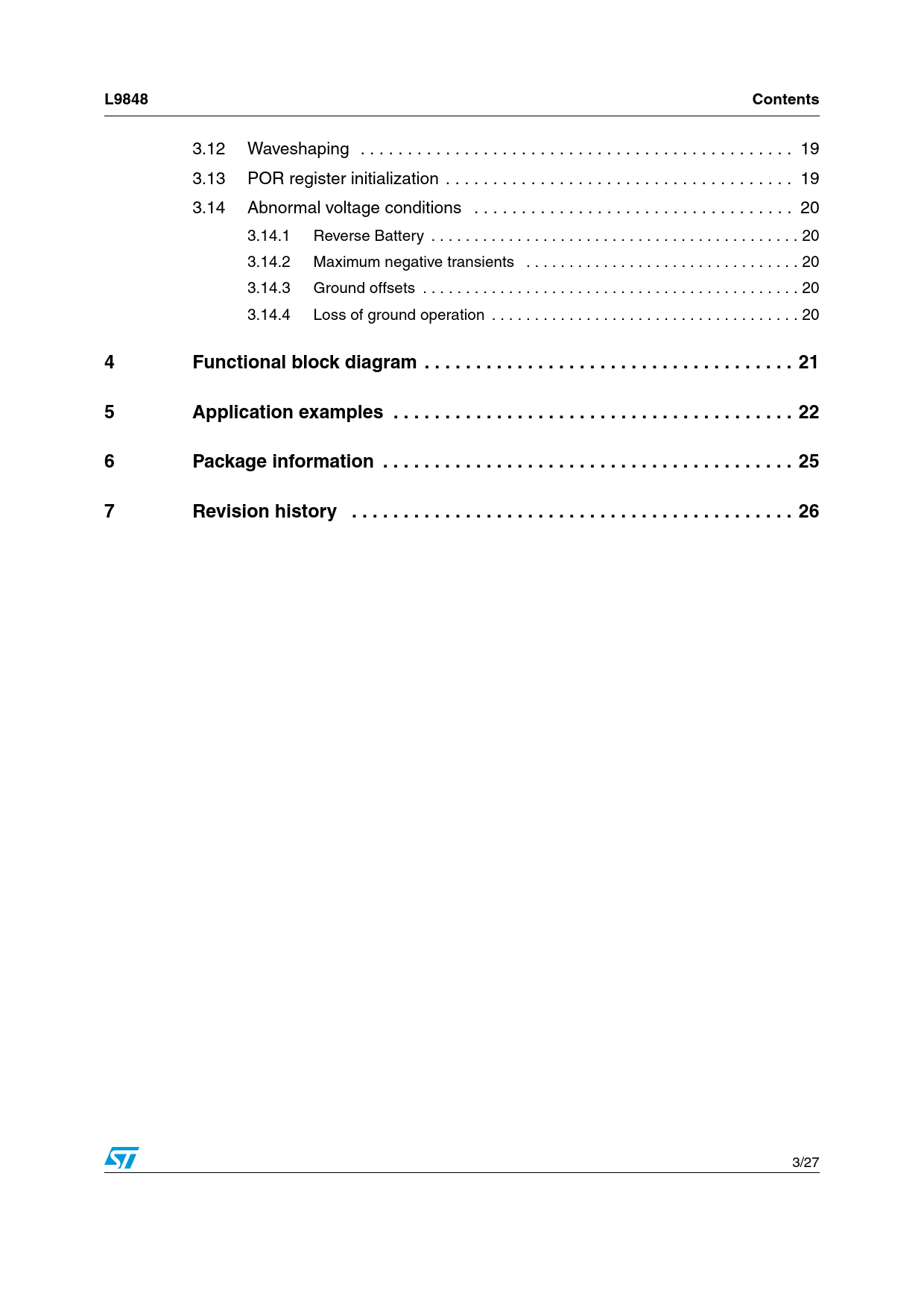 link to page 19 link to page 19 link to page 20 link to page 20 link to page 20 link to page 20 link to page 20 link to page 21 link to page 22 link to page 25 link to page 26 L9848Contents 3.12 Waveshaping . 19 3.13 POR register initialization . 19 3.14 Abnormal voltage conditions . 20 3.14.1 Reverse Battery . 20 3.14.2 Maximum negative transients . 20 3.14.3 Ground offsets . 20 3.14.4 Loss of ground operation . 20 4Functional block diagram . 215Application examples . 226Package information . 257Revision history . 26 3/27 Document Outline Table 1. Device summary 1 Block diagram and pin description Figure 1. Block diagram Figure 2. Pin connection (top view) Table 2. Pin description 2 Electrical specifications 2.1 Absolute maximum ratings Table 3. Absolute maximum ratings 2.2 Operation conditions Table 4. Operation conditions 2.3 Thermal data Table 5. Thermal data 2.4 Electrical characteristcs 2.4.1 DC characteristics Table 6. Electrical characteristcs 2.4.2 AC characteristics Table 7. AC characteristics Figure 3. DO loading for disable time measurement Figure 4. Output loading for slew rate measurement Figure 5. Output turn on/off delays and slew rates Figure 6. SPI input/output slew ratest Figure 7. SPI timing diagram 3 Functional description 3.1 General features 3.2 Outputs - Common characteristics 3.2.1 Output 1-4 3.2.2 Output 5-6 3.2.3 Output7-8 3.3 Main power input (VDD) 3.4 Discrete inputs (IN5-6) 3.5 Serial peripheral interface (SPI) 3.5.1 Serial data output (DO) 3.5.2 Serial data input (DI) 3.5.3 Chip select (CS) 3.5.4 Serial clock (SCLK) 3.6 SPI DI input command register Table 8. Bit command register definition Table 9. Command register logic definition 3.7 Fault operation Table 10. Fault register definition Table 11. Fault logic definition 3.7.1 Initial fault register SPI Cycle 3.7.2 Incandescent lamp outputs 3.8 Configuration for Output1-6 3.8.1 Low side drivers 3.8.2 High side drivers 3.9 DRN1-6 susceptibility to negative voltage transients 3.10 Thermal shutdown 3.11 Charge pump usage 3.12 Waveshaping 3.13 POR register initialization 3.14 Abnormal voltage conditions 3.14.1 Reverse Battery 3.14.2 Maximum negative transients 3.14.3 Ground offsets 3.14.4 Loss of ground operation 4 Functional block diagram Figure 8. L9848 with external components 5 Application examples Figure 9. L9848 as mirror axis control motor drivers Figure 10. L9848 as mirror motor and bulb driver Figure 11. L9848 as window lift relay and mirror motor driver Figure 12. L9848 as bipolar stepper motor driver Figure 13. L9848 driving approach for 3 bipolar stepper-motors in sequential mode for climate applications as window lift relay and mirror motor driver 6 Package information Figure 14. SO-28 mechanical data and package dimensions 7 Revision history Table 12. Document revision history