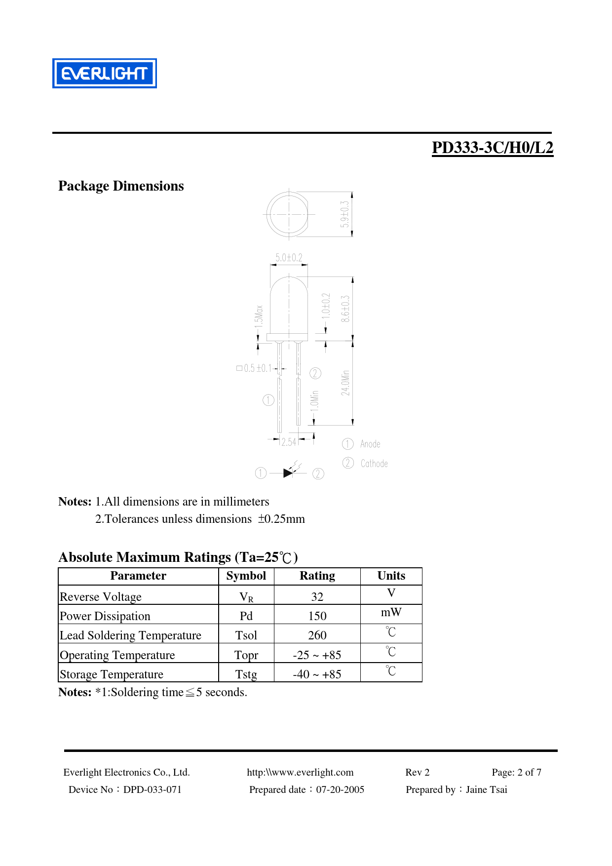 *1:Soldering time≦5 seconds. Everlight Electronics Co., Ltd. http:\\www.everlight.com Rev 2 Page: 2 of 7 Device No:DPD-033-071 Prepared date:07-20-2005 Prepared by:Jaine Tsai