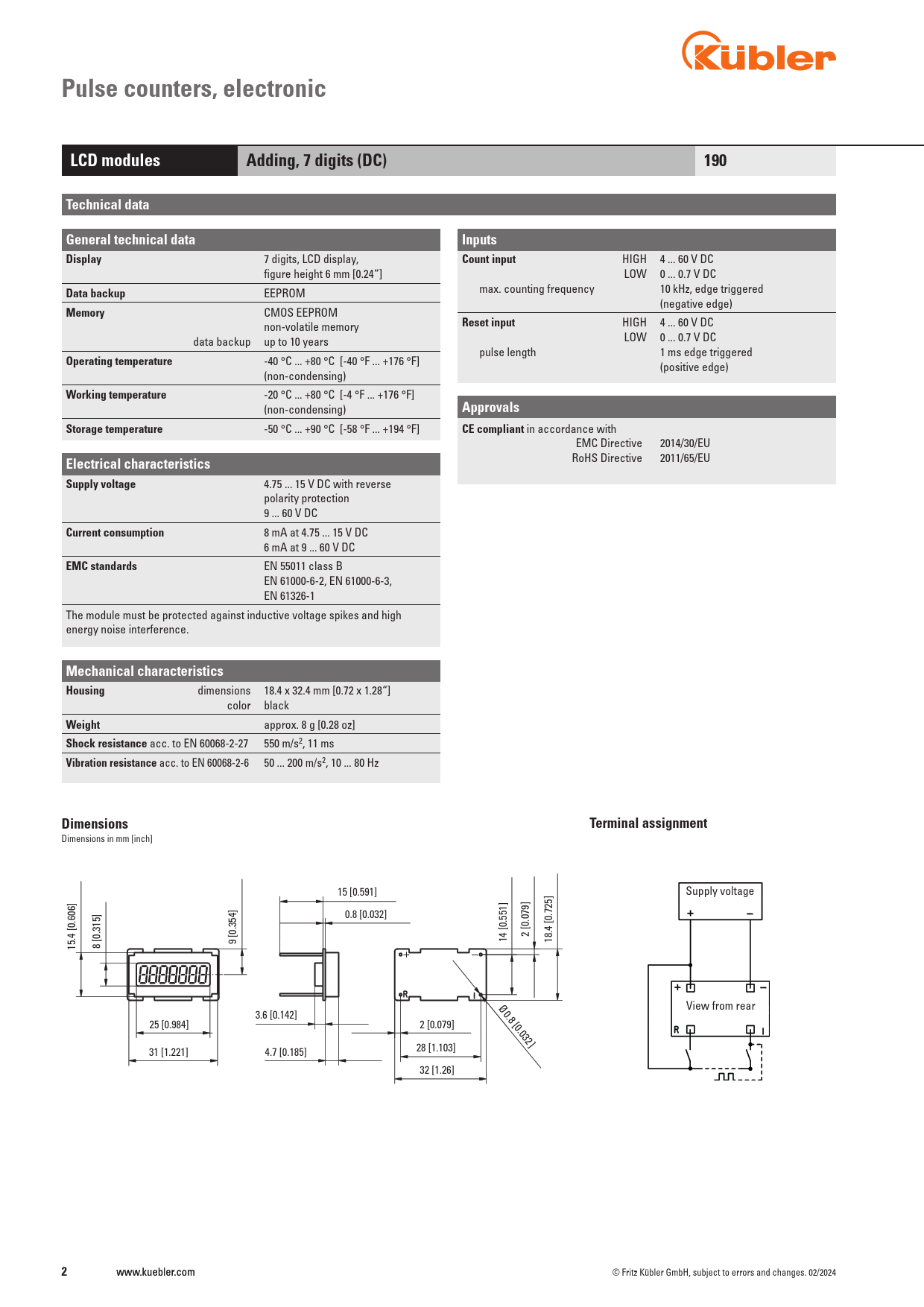 Pulse counters, electronic. LCD modules. Adding, 7 digits (DC). 190. Technical data. General technical data. Inputs. Display