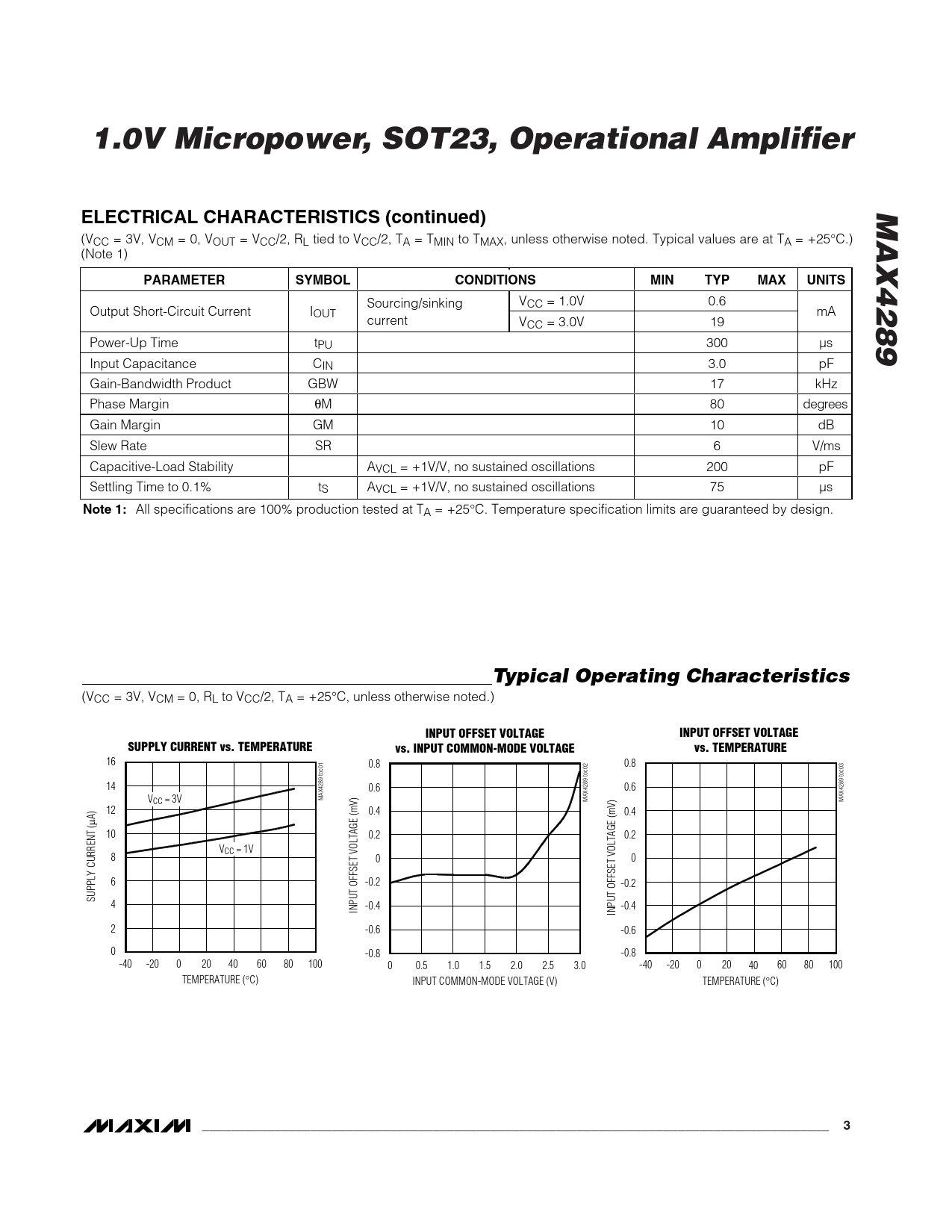 1.0V Micropower, SOT23, Operational Amplifier. MAX4289. ELECTRICAL CHARACTERISTICS (continued). PARAMETER. SYMBOL. CONDITIONS. MIN