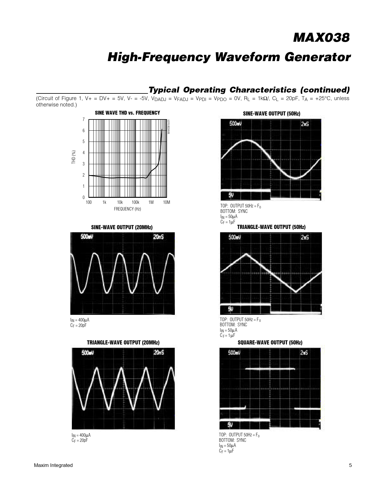 7 6 MAX038 toc01 5 4 THD (%) 3 2 1 0 100 1k 10k 100k 1M 10M TOP: OUTPUT 50Hz = Fo FREQUENCY (Hz) BOTTOM: SYNC IIN = 50μA CF = 1μF