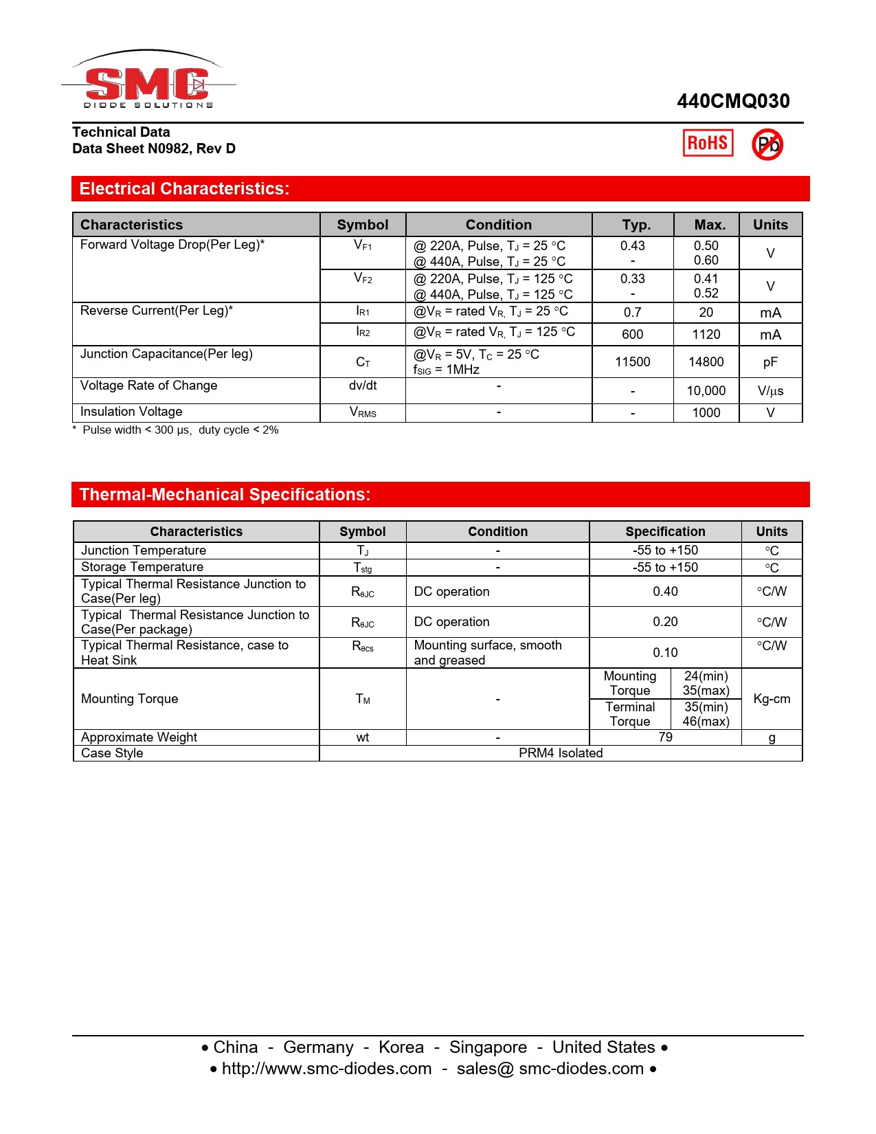 Junction Temperature TJ - -55 to +150 C Storage Temperature Tstg - -55 to +150 C Typical Thermal Resistance Junction to Case(Per leg) RJC DC operation 0.40 C/W Typical Thermal Resistance Junction to Case(Per package) RJC DC operation 0.20 C/W Typical Thermal Resistance, case to Rcs Mounting surface, smooth Heat Sink and greased 0.10 C/W Mounting 24(min) Mounting Torque T Torque 35(max) M - Kg-cm Terminal 35(min) Torque 46(max) Approximate Weight wt - 79 g Case Style PRM4 Isolated China - Germany - Korea - Singapore - United States http://www.smc-diodes.com - sales@ smc-diodes.com Document Outline 440CMQ030 SCHOTTKY RECTIFIER