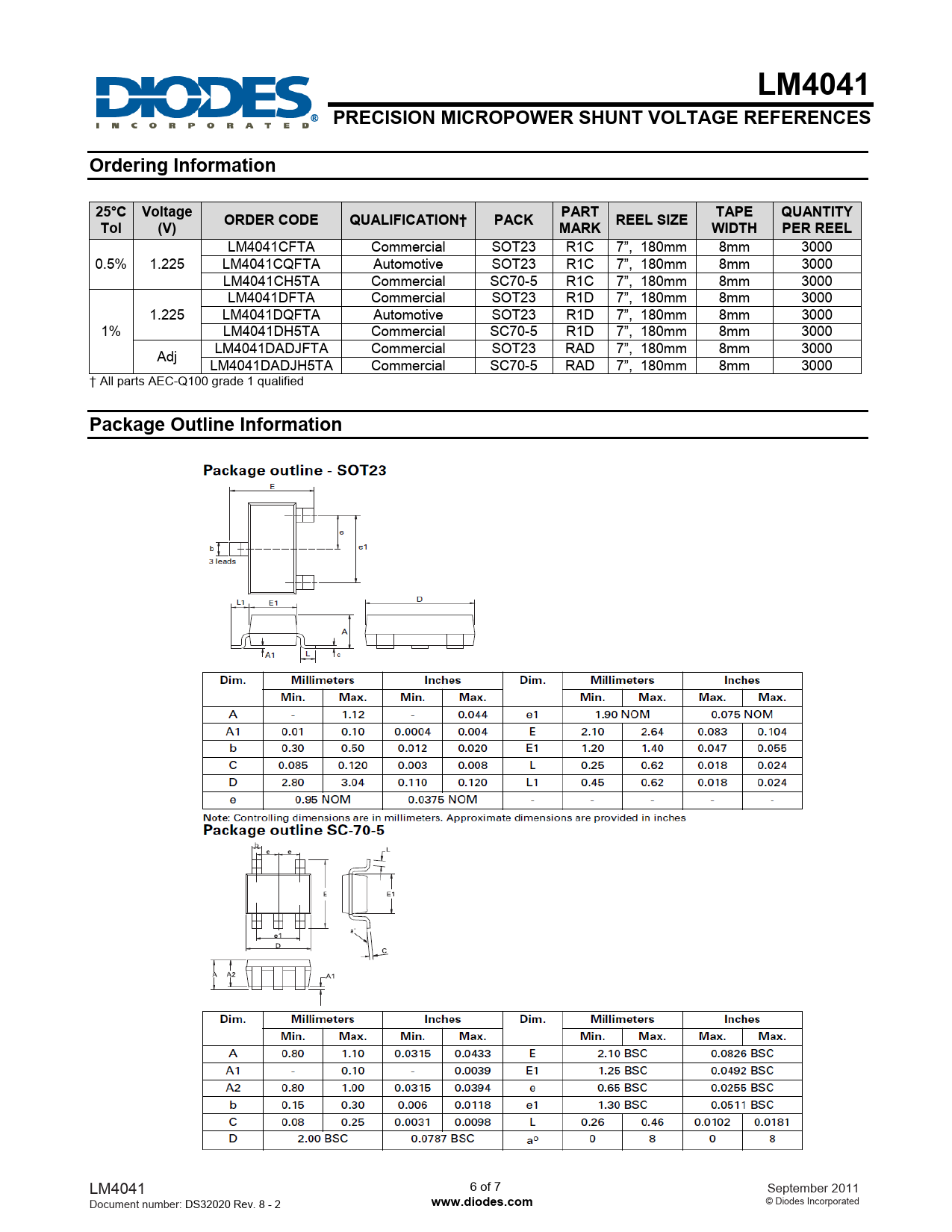 LM4041CFTA Commercial SOT23 R1C 7”, 180mm 8mm 3000 0.5% 1.225 LM4041CQFTA Automotive SOT23 R1C 7”, 180mm 8mm 3000 LM4041CH5TA Commercial SC70-5 R1C 7”, 180mm 8mm 3000 LM4041DFTA Commercial SOT23 R1D 7”, 180mm 8mm 3000 1.225 LM4041DQFTA Automotive SOT23 R1D 7”, 180mm 8mm 3000 1% LM4041DH5TA Commercial SC70-5 R1D 7”, 180mm 8mm 3000 LM4041DADJFTA Commercial SOT23 RAD 7”, 180mm 8mm 3000 Adj LM4041DADJH5TA Commercial SC70-5 RAD 7”, 180mm 8mm 3000 † All parts AEC-Q100 grade 1 qualified
