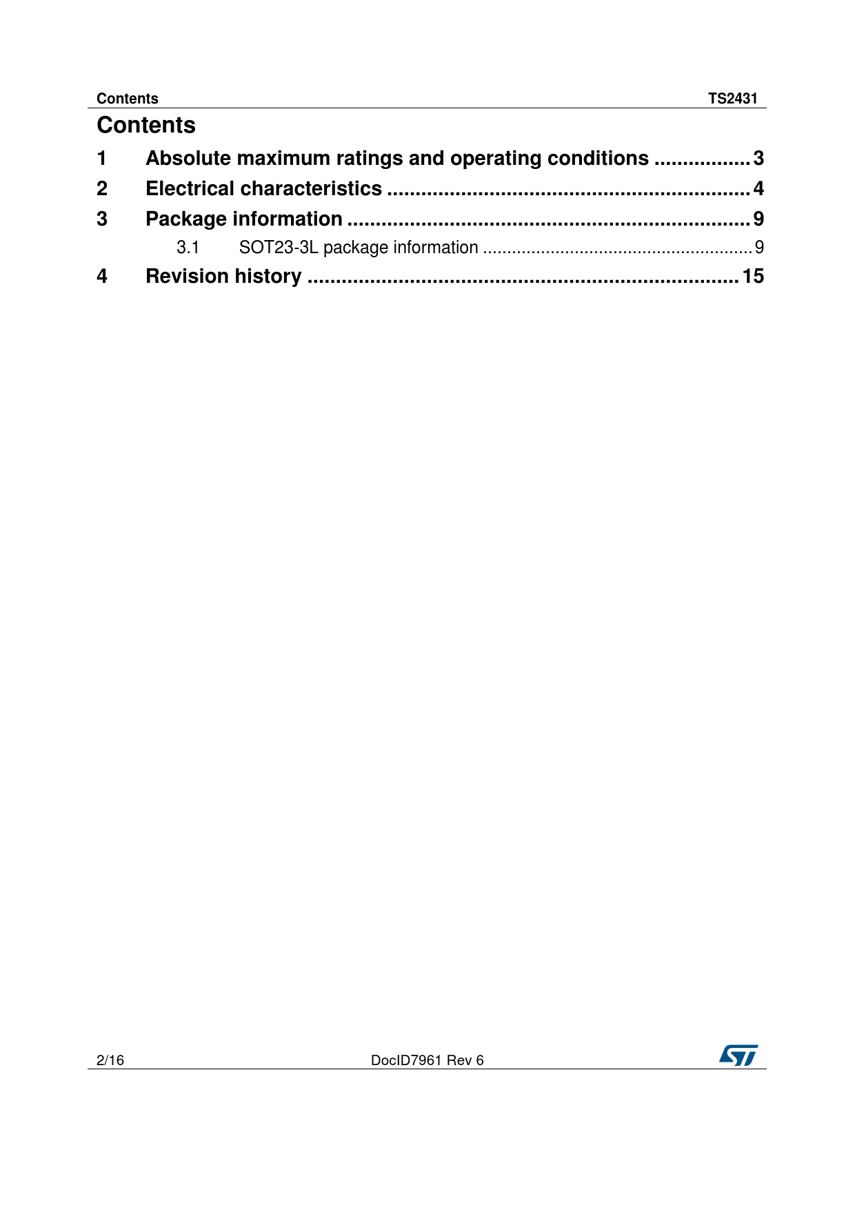 Contents TS2431 Contents 1 Absolute maximum ratings and operating conditions ... 3 2 Electrical characteristics .. 4 3 Package information ... 9