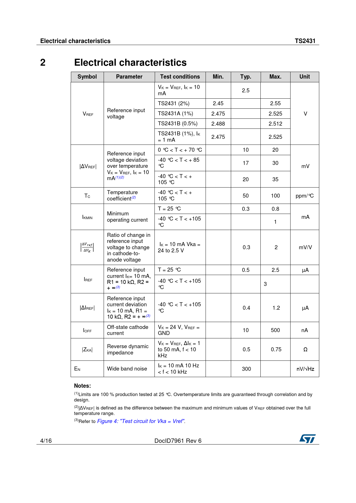 link to page 4 link to page 4 link to page 4 link to page 4 link to page 4 link to page 5 Electrical characteristicsTS24312Electrical characteristicsSymbolParameterTest conditionsMin.Typ.Max.Unit VK = VREF, IK = 10 2.5 mA TS2431 (2%) 2.45 2.55 Reference input VREF TS2431A (1%) 2.475 2.525 V voltage TS2431B (0.5%) 2.488 2.512 TS2431B (1%), IK 2.475 2.525 = 1 mA 0 °C < T < + 70 °C 10 20 Reference input voltage deviation -40 °C < T < + 85 17 30 |ΔVREF| over temperature °C mV VK = VREF, IK = 10 mA(1)(2) -40 °C < T < + 20 35 105 °C Temperature -40 °C < T < + TC 50 100 ppm/°C coefficient(2) 105 °C T = 25 °C 0.3 0.8 Minimum IKMIN mA operating current -40 °C < T < +105 1 °C Ratio of change in reference input |Δ𝑉𝑟𝑒𝑓| I voltage to change K = 10 mA Vka = Δ𝑉 0.3 2 mV/V 𝐾 24 to 2.5 V in cathode-to- anode voltage Reference input T = 25 °C 0.5 2.5 µA current I I K= 10 mA, REF R1 = 10 kΩ, R2 = -40 °C < T < +105 3 + ∞(3) °C Reference input |ΔI current deviation -40 °C < T < +105 REF| 0.4 1.2 µA IK = 10 mA, R1 = °C 10 kΩ, R2 = + ∞(3) Off-state cathode V I K = 24 V, VREF = OFF 10 500 nA current GND V Reverse dynamic K = VREF, ΔIK = 1 |ZKA| to 50 mA, f < 10 0.5 0.75 Ω impedance kHz I E K = 10 mA 10 Hz N Wide band noise 300 nV/√Hz < f < 10 kHz Notes: (1)Limits are 100 % production tested at 25 °C. Overtemperature limits are guaranteed through correlation and by design. (2)|ΔVREF| is defined as the difference between the maximum and minimum values of VREF obtained over the full temperature range. (3)Refer to Figure 4: "Test circuit for Vka = Vref". 4/16 DocID7961 Rev 6