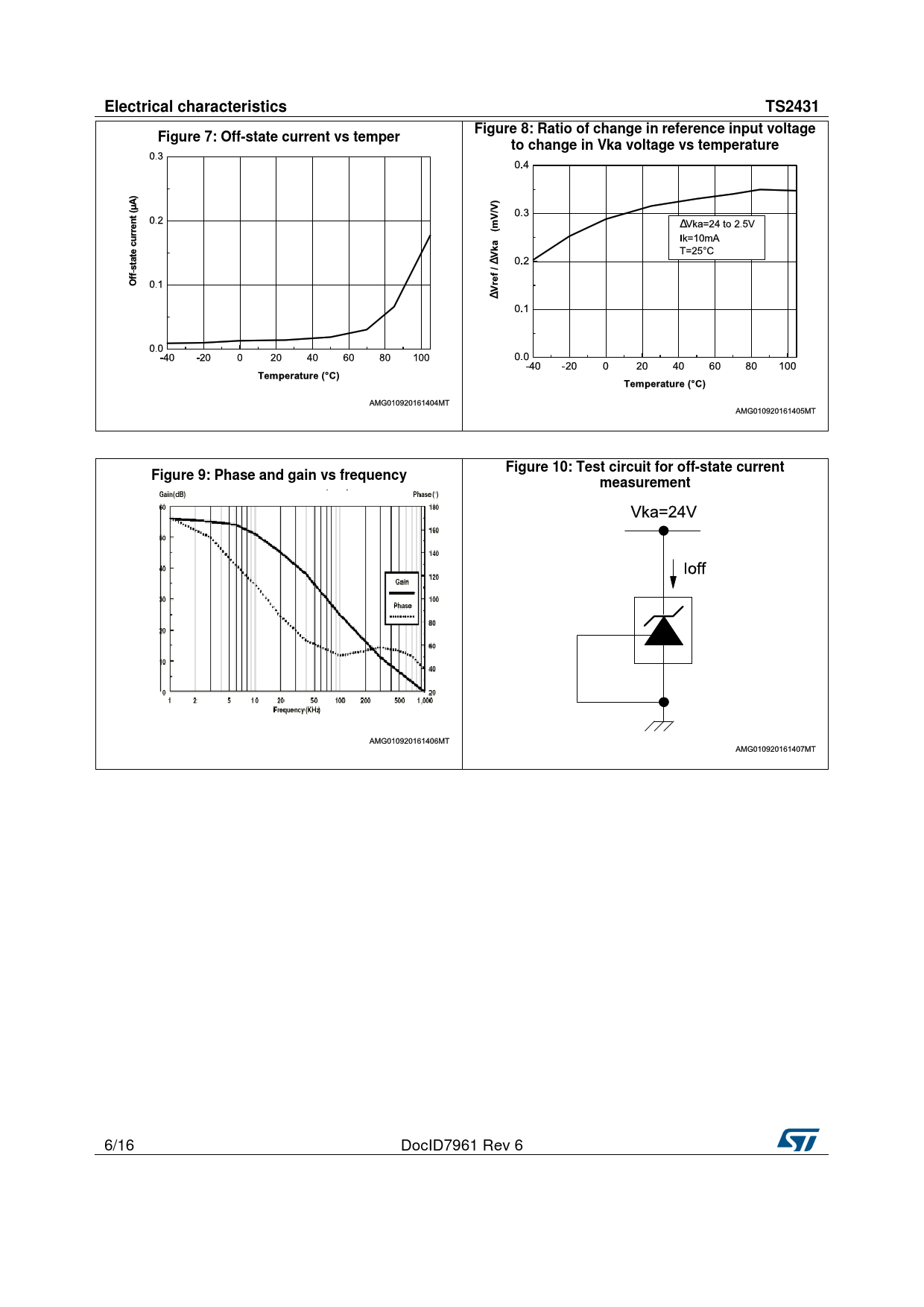 Electrical characteristics TS2431 Figure 8: Ratio of change in reference input voltage Figure 7: Off-state current vs temper to change in Vka voltage vs temperature Figure 10: Test circuit for off-state current Figure 9: Phase and gain vs frequency measurement