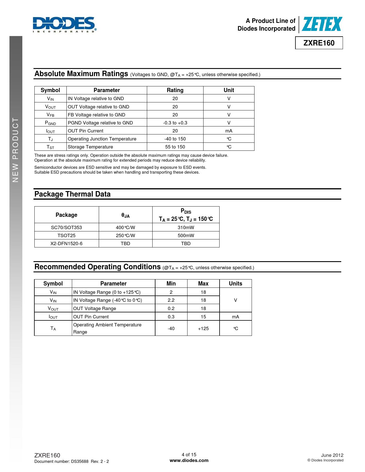 | 页数 / 页 | 15 / 4 — A Product Line of. Diodes Incorporated. ZXRE160. Absolute Maximum … |