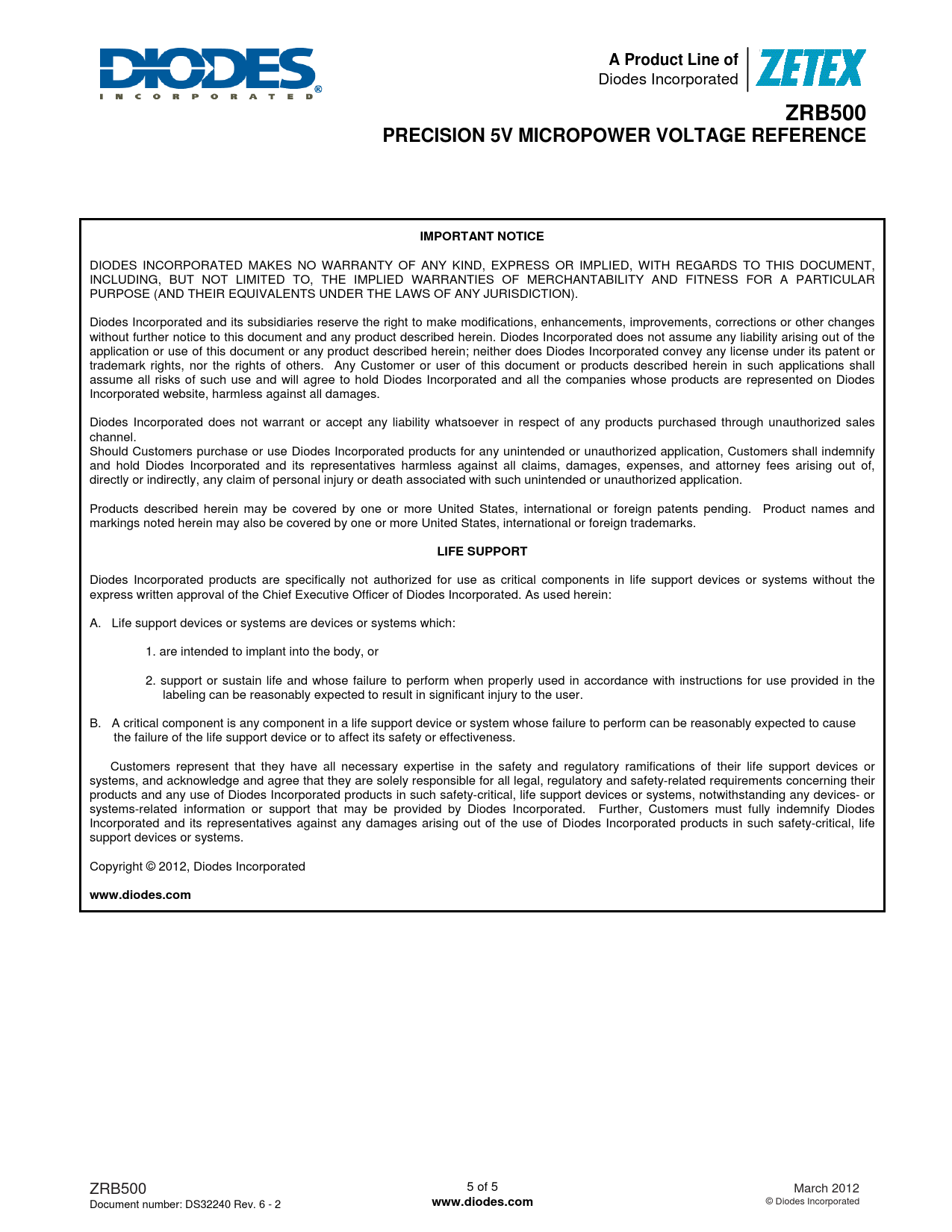 A Product Line of. ZRB500. PRECISION 5V MICROPOWER VOLTAGE REFERENCE. IMPORTANT NOTICE. LIFE SUPPORT. www.diodes.com