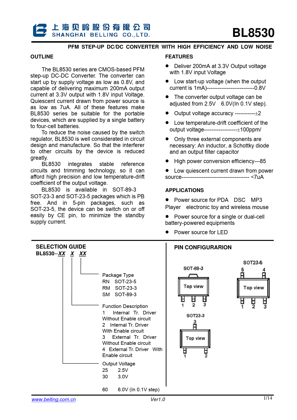 BL8530PFM STEP-UP DC/DC CONVERTER WITH HIGH EFFICIENCY AND LOW NOISEOUTLINE : FEATURES : • Deliver 200mA at 3.3V Output voltage The BL8530 series are CMOS-based PFM with 1.8V input Voltage step-up DC-DC Converter. The converter can start up by supply voltage as low as 0.8V, and • Low start-up voltage (when the output capable of delivering maximum 200mA output current is 1mA)--------------------------0.8V current at 3.3V output with 1.8V input Voltage. • The converter output voltage can be Quiescent current drawn from power source is adjusted from 2.5V~6.0V(In 0.1V step). as low as 7uA. All of these features make BL8530 series be suitable for the portable • Output voltage accuracy -----------±2% devices, which are supplied by a single battery • Low temperature-drift coefficient of the to four-cell batteries. To reduce the noise caused by the switch output voltage------------------±100ppm/℃ regulator, BL8530 is well considerated in circuit • Only three external components are design and manufacture. So that the interferer necessary: An inductor, a Schottky diode to other circuits by the device is reduced and an output filter capacitor greatly. • BL8530 integrates stable reference High power conversion efficiency---85% circuit s and trimming technology, so it can • Low quiescent current drawn from power af ford high precision and low temperature-drift source------------------------------------- <7uA coef ficient of the output voltage. BL8530 is available in SOT-89-3 、 APPLICATIONS : SOT- 23-3 and SOT-23-5 packages which is PB • Power source for PDA、DSC、MP3 free. And in 5-pin packages, such as Player、electronic toy and wireless mouse SOT-23-5, the device can be switch on or off easily by CE pin, to minimize the standby • Power source for a single or dual-cell supply current. battery-powered equipments • Power source for LED SELECTION GUIDE : PIN CONFIGURARION : BL8530 -- XX X XX Package Type: RN:SOT-23-5 RM:SOT-23-3 SM:SOT-89-3 Function Description: 1 : Internal Tr. Driver , Without Enable circuit 2:Internal Tr. Driver, With Enable circuit 3 : External Tr. Driver , Without Enable circuit 4:External Tr. Driver,With Enable circuit Output Voltage: 25……2.5V 30……3.0V …… 60……6.0V (In 0.1V step) www.belling.com.cn Ver1.0 1/ 14
