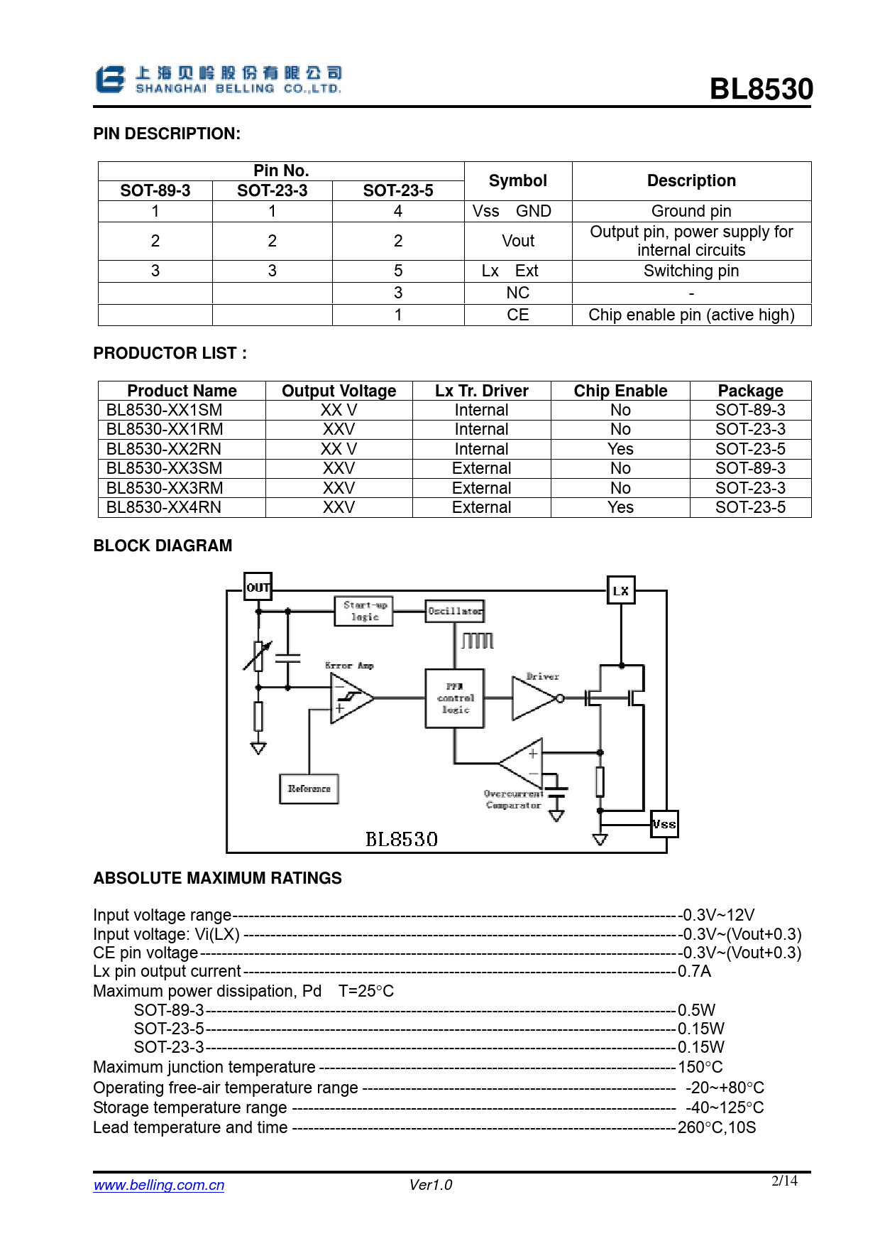Input voltage range-----------------------------------------------------------------------------------0.3V~12V Input voltage: Vi(LX) ---------------------------------------------------------------------------------0.3V~(Vout+0.3) CE pin voltage-----------------------------------------------------------------------------------------0.3V~(Vout+0.3) Lx pin output current --------------------------------------------------------------------------------0.7A Maximum power dissipation, Pd T=25°C SOT-89-3---------------------------------------------------------------------------------------0.5W SOT-23-5---------------------------------------------------------------------------------------0.15W SOT-23-3---------------------------------------------------------------------------------------0.15W Maximum junction temperature ------------------------------------------------------------------150°C Operating free-air temperature range ---------------------------------------------------------- -20~+80°C Storage temperature range ----------------------------------------------------------------------- -40~125°C Lead temperature and time -----------------------------------------------------------------------260°C,10S www.belling.com.cn Ver1.0 2/ 14
