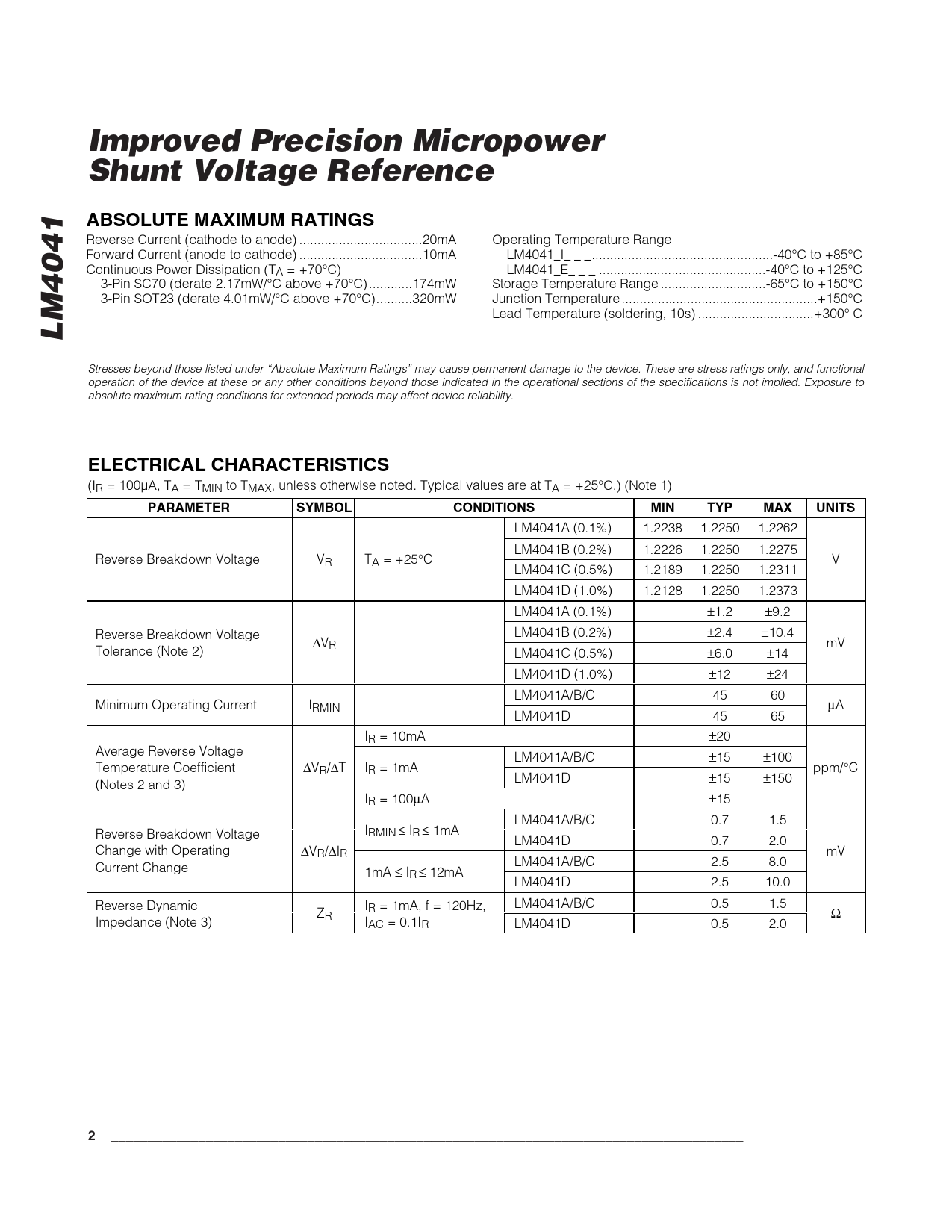 Improved Precision Micropower Shunt Voltage ReferenceABSOLUTE MAXIMUM RATINGS Reverse Current (cathode to anode) ..20mA Operating Temperature Range Forward Current (anode to cathode) ..10mA LM4041_I_ _ _..-40°C to +85°C Continuous Power Dissipation (TA = +70°C) LM4041_E_ _ _ ..-40°C to +125°C 3-Pin SC70 (derate 2.17mW/°C above +70°C) ..174mW Storage Temperature Range ...-65°C to +150°C 3-Pin SOT23 (derate 4.01mW/°C above +70°C)..320mW Junction Temperature ..+150°C Lead Temperature (soldering, 10s) ..+300° C LM4041 Stresses beyond those listed under “Absolute Maximum Ratings” may cause permanent damage to the device. These are stress ratings only, and functional operation of the device at these or any other conditions beyond those indicated in the operational sections of the specifications is not implied. Exposure to absolute maximum rating conditions for extended periods may affect device reliability. ELECTRICAL CHARACTERISTICS (IR = 100µA, TA = TMIN to TMAX, unless otherwise noted. Typical values are at TA = +25°C.) (Note 1) PARAMETERSYMBOLCONDITIONSMINTYPMAXUNITS LM4041A (0.1%) 1.2238 1.2250 1.2262 LM4041B (0.2%) 1.2226 1.2250 1.2275 Reverse Breakdown Voltage VR TA = +25°C V LM4041C (0.5%) 1.2189 1.2250 1.2311 LM4041D (1.0%) 1.2128 1.2250 1.2373 LM4041A (0.1%) ±1.2 ±9.2 Reverse Breakdown Voltage LM4041B (0.2%) ±2.4 ±10.4 ΔVR mV Tolerance (Note 2) LM4041C (0.5%) ±6.0 ±14 LM4041D (1.0%) ±12 ±24 LM4041A/B/C 45 60 Minimum Operating Current IRMIN μA LM4041D 45 65 IR = 10mA ±20 Average Reverse Voltage LM4041A/B/C ±15 ±100 Temperature Coefficient ΔVR/ΔT IR = 1mA ppm/°C LM4041D ±15 ±150 (Notes 2 and 3) IR = 100μA ±15 LM4041A/B/C 0.7 1.5 IRMIN Reverse Breakdown Voltage ≤ I ≤ 1mA R LM4041D 0.7 2.0 Change with Operating ΔVR/ΔIR mV LM4041A/B/C 2.5 8.0 Current Change 1mA ≤ IR ≤ 12mA LM4041D 2.5 10.0 Reverse Dynamic I LM4041A/B/C 0.5 1.5 Z R = 1mA, f = 120Hz, R Ω Impedance (Note 3) IAC = 0.1IR LM4041D 0.5 2.0 2_______________________________________________________________________________________