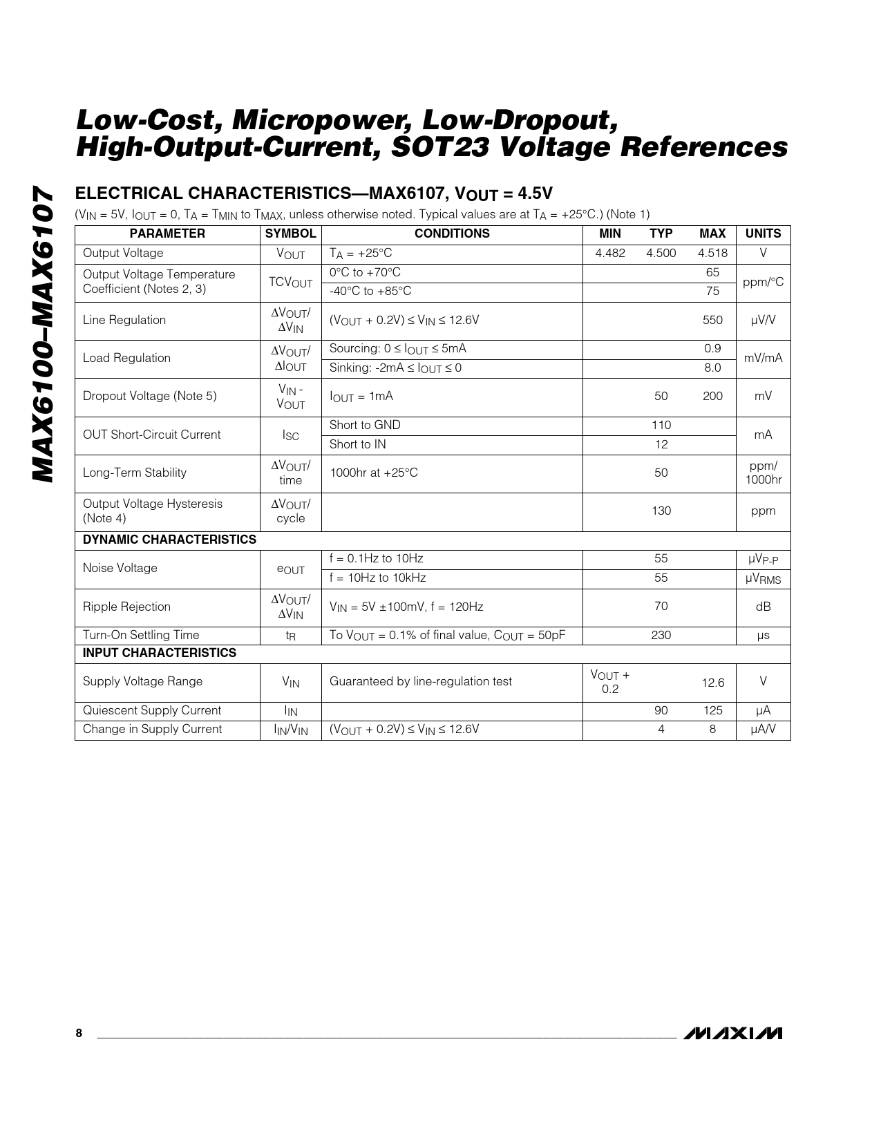 Low-Cost, Micropower, Low-Dropout, High-Output-Current, SOT23 Voltage References ELECTRICAL CHARACTERISTICS—MAX6107, VOUT = 4.5V
