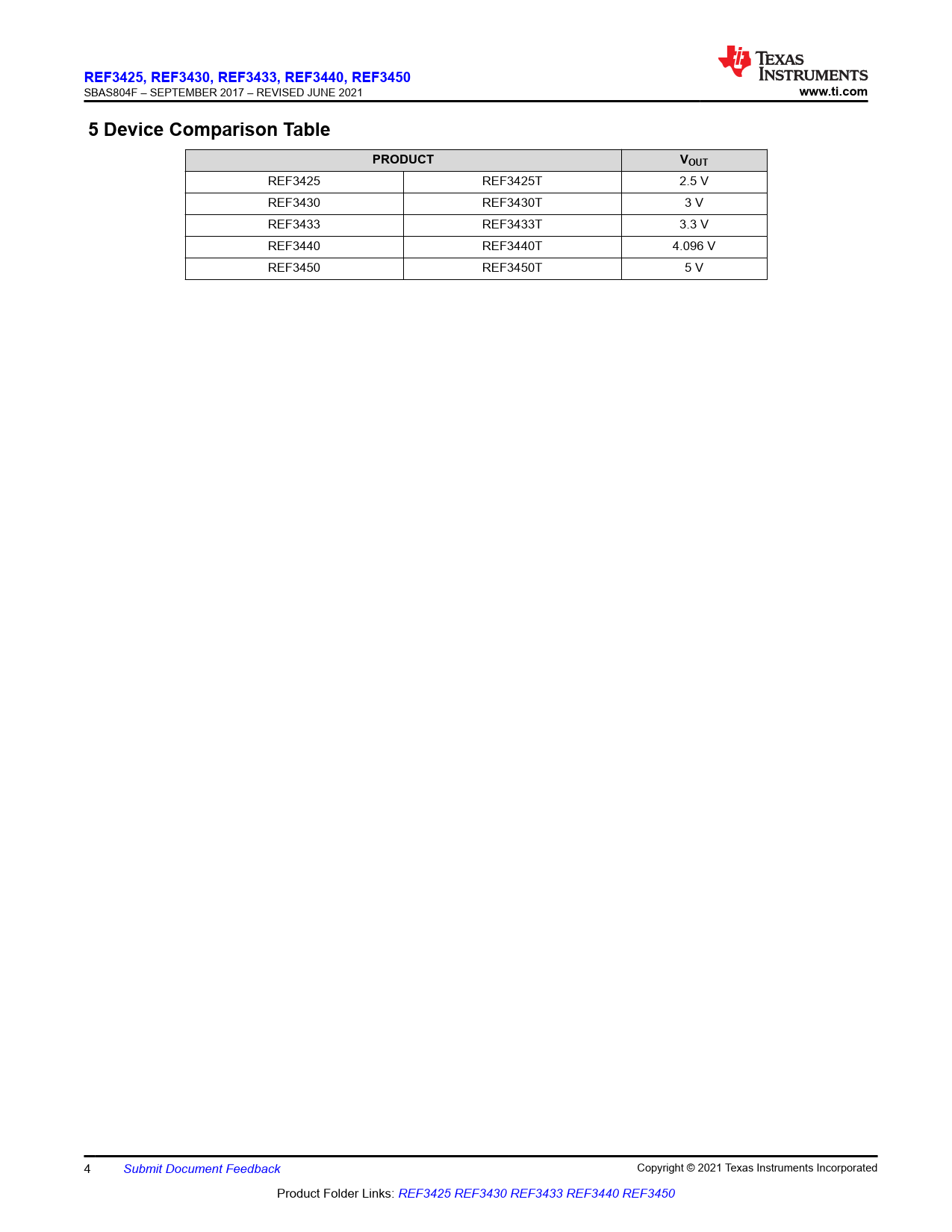 REF3425. , REF3430, REF3433, REF3440, REF3450. www.ti.com. 5 Device Comparison Table. PRODUCT. VOUT