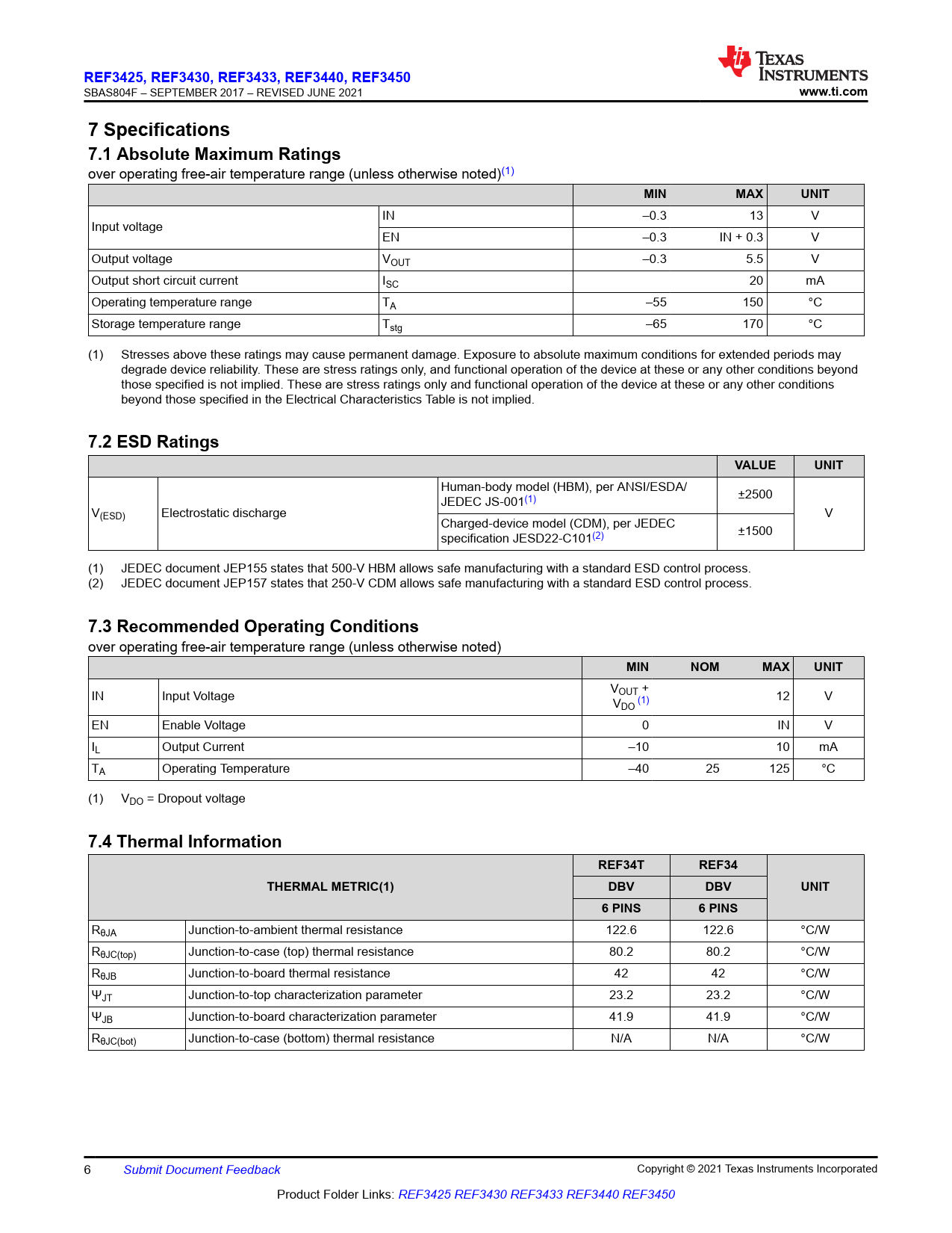 7.4 Thermal Information REF34T REF34 THERMAL METRIC(1) DBV DBV UNIT 6 PINS 6 PINS